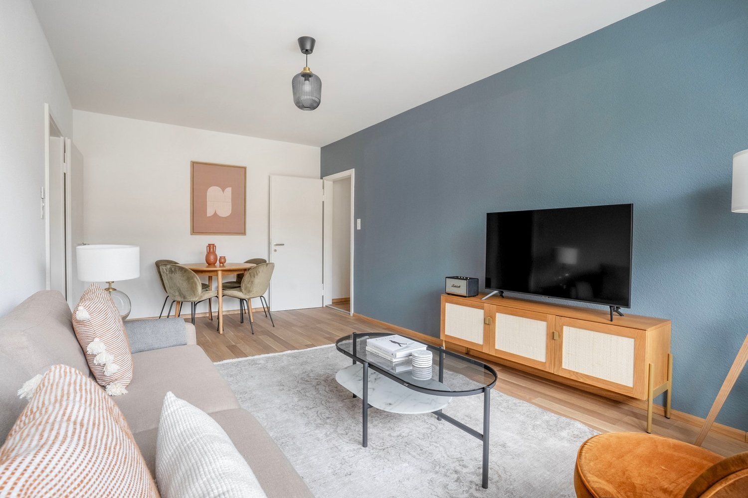 Wie bei jedem Blueground Wohnung finden Sie einen durchdacht gestalteten Raum mit schönen Möbeln. und eine voll ausgestattete Küche in diesem Zwei-Schlafzimmern Immobilie. Und dank unserer hochwertigen Matratzen können Sie sich entspannen, weil Sie sich immer wie zu Hause fühlen werden. Wenn Sie Lust auf etwas Spaß haben, können Sie die Basel -Atmosphäre genießen oder sich die Unterhaltung mit dem kabellosen Premium-Lautsprecher oder dem Smart-TV direkt nach Hause holen.