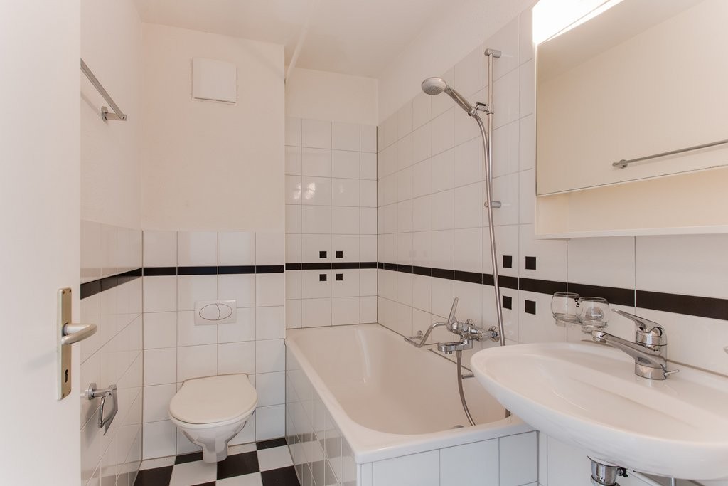 - Badezimmer mit Badewanne, WC, Spiegelschrank und Lavabo