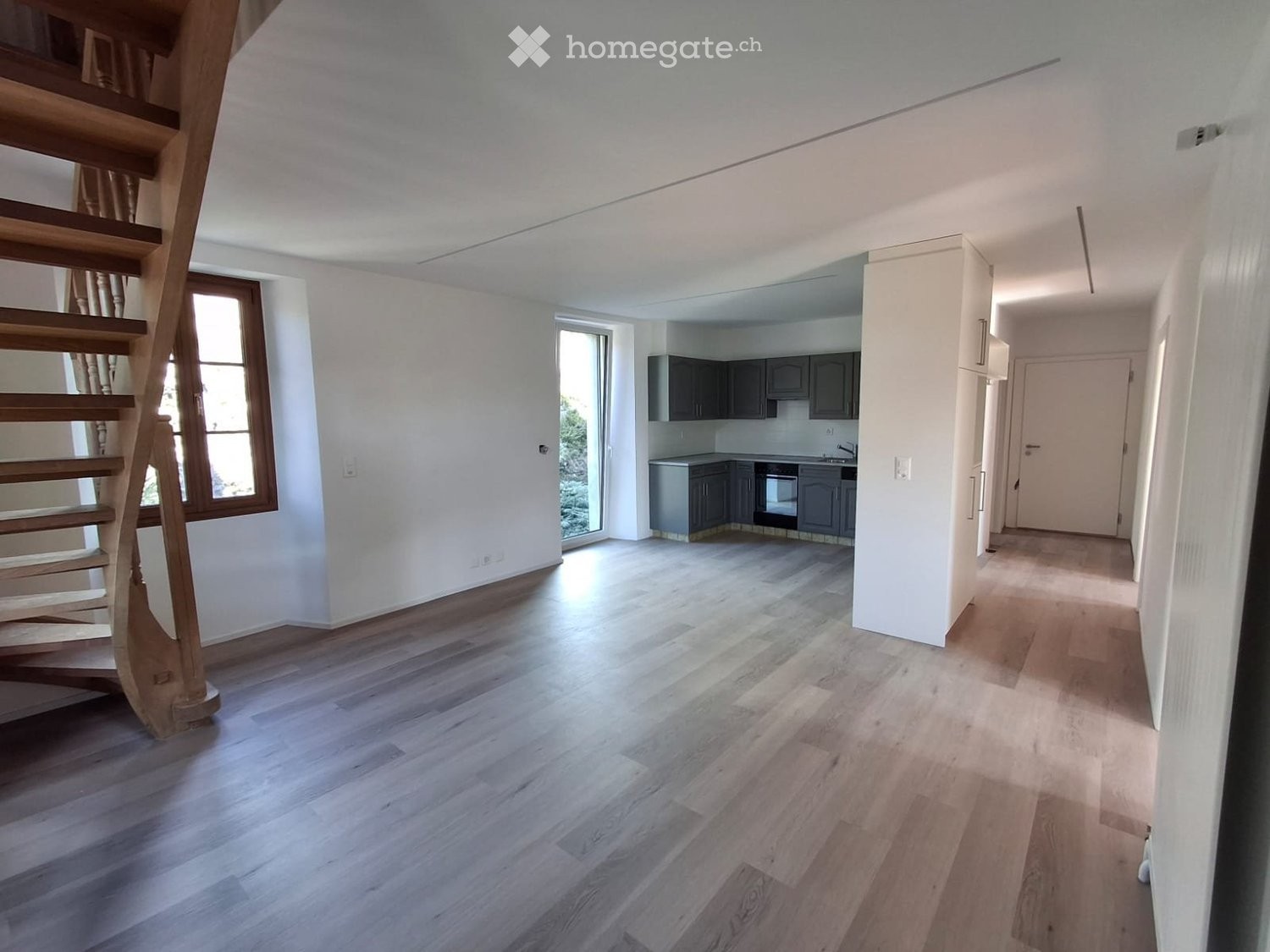 Rez: cuisine équipée (avec accès terrasse) ouverte sur salon et coin à manger, sdb douche, 2 grandes chambres.