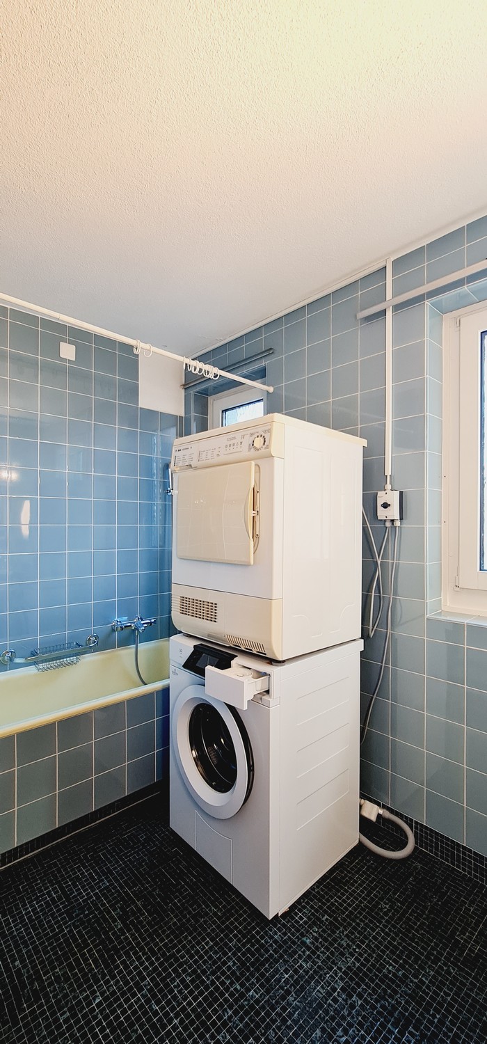 Bathroom with shower, bathtub, double washbasin, washing machine and tumble dryer