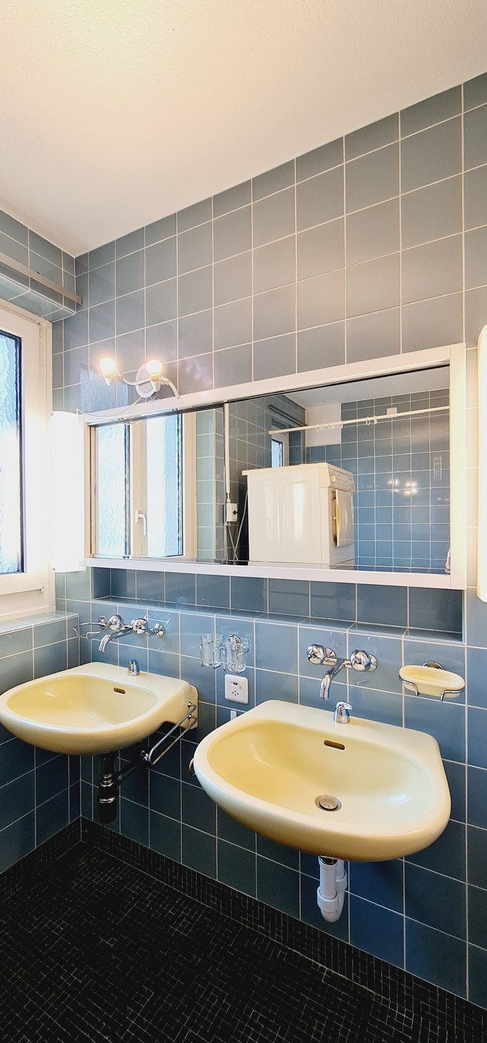 Badezimmer mit Dusche, Badewanne, Doppellavabo, Waschmaschine und Tumbler