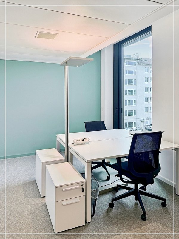 Dieses Angebot umfasst 8 m² möblierte private Bürofläche und 50 m² Gemeinschaftsflächen: Besprechungsräume, offener Coworking-Bereich, Lounge, Kaffeeküche und Empfangsbereich mit Büroausstattung.