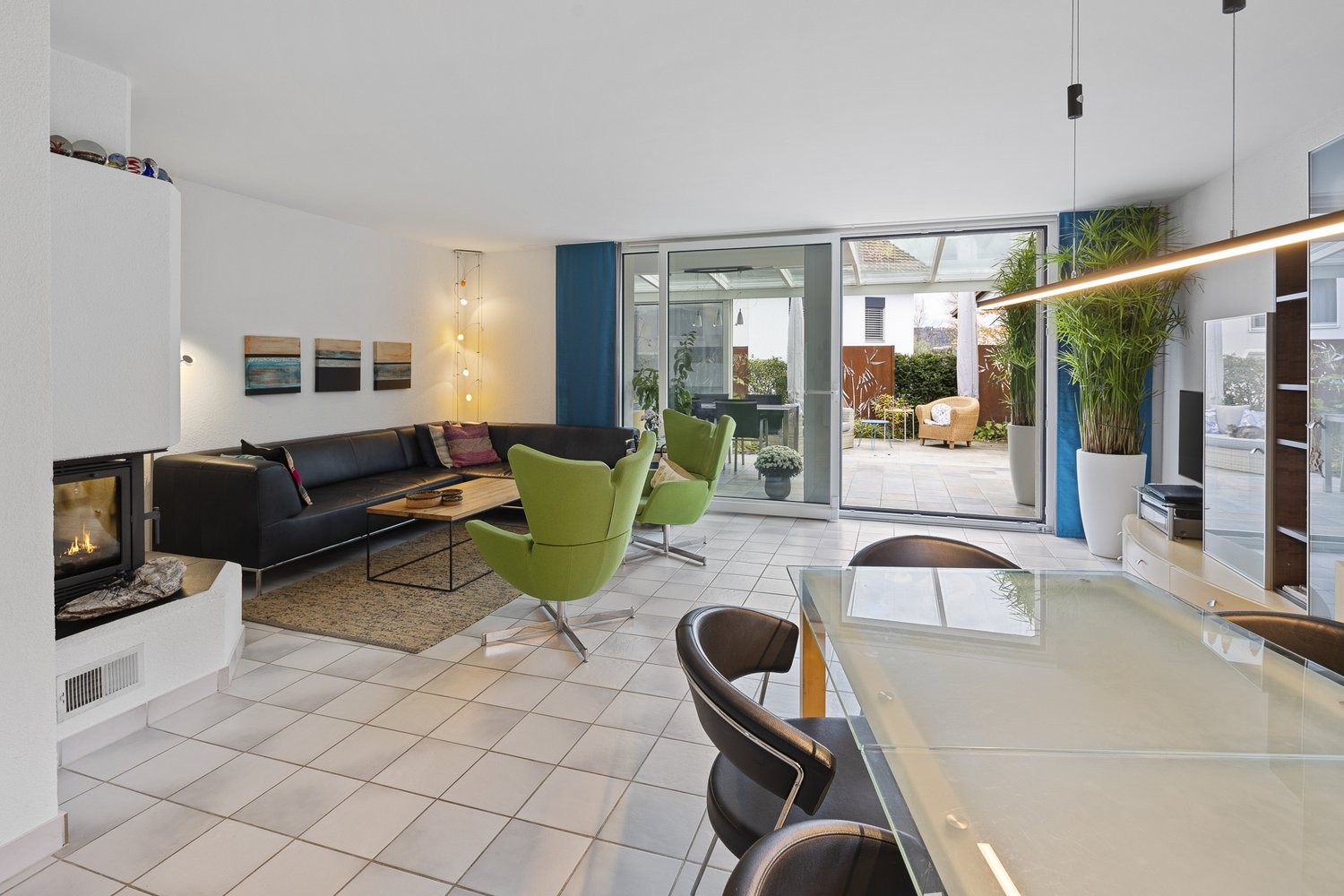 - Wohn- Esszimmer mit Cheminée und grosser Fensterfront