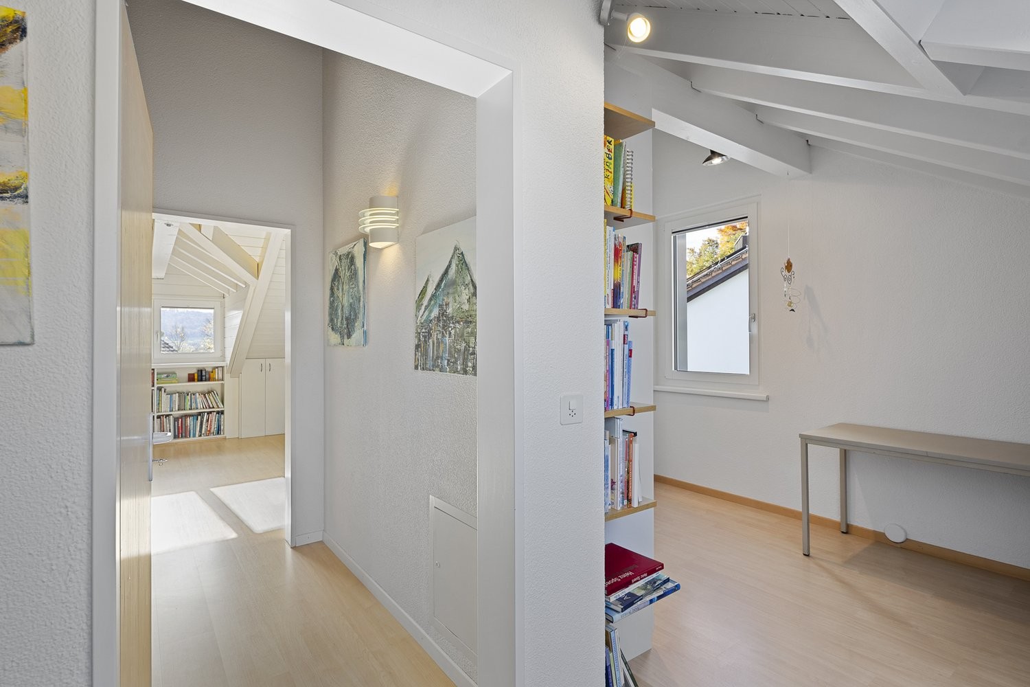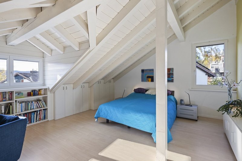 Das komplett ausgebaute Dachgeschoss beherbergt zwei weitere grosszügige Zimmer. Eines überzeugt mit seiner Grösse sowie den charmanten Dachbalken und der Lukarne, die für eine heimelige Atmosphäre sorgen. Zahlreiche Einbauschränke sorgen für optimal genutzten Stauraum. Das zweite Zimmer bietet ebenfalls viel Raum und flexible Nutzungsmöglichkeiten. Hier besteht zudem die Option, eine zweite Nasszelle einzubauen, da die Anschlüsse bereits vorhanden sind. So lässt sich der Dachstock beispielsweise in einen idealen Rückzugsort für die Eltern verwandeln.