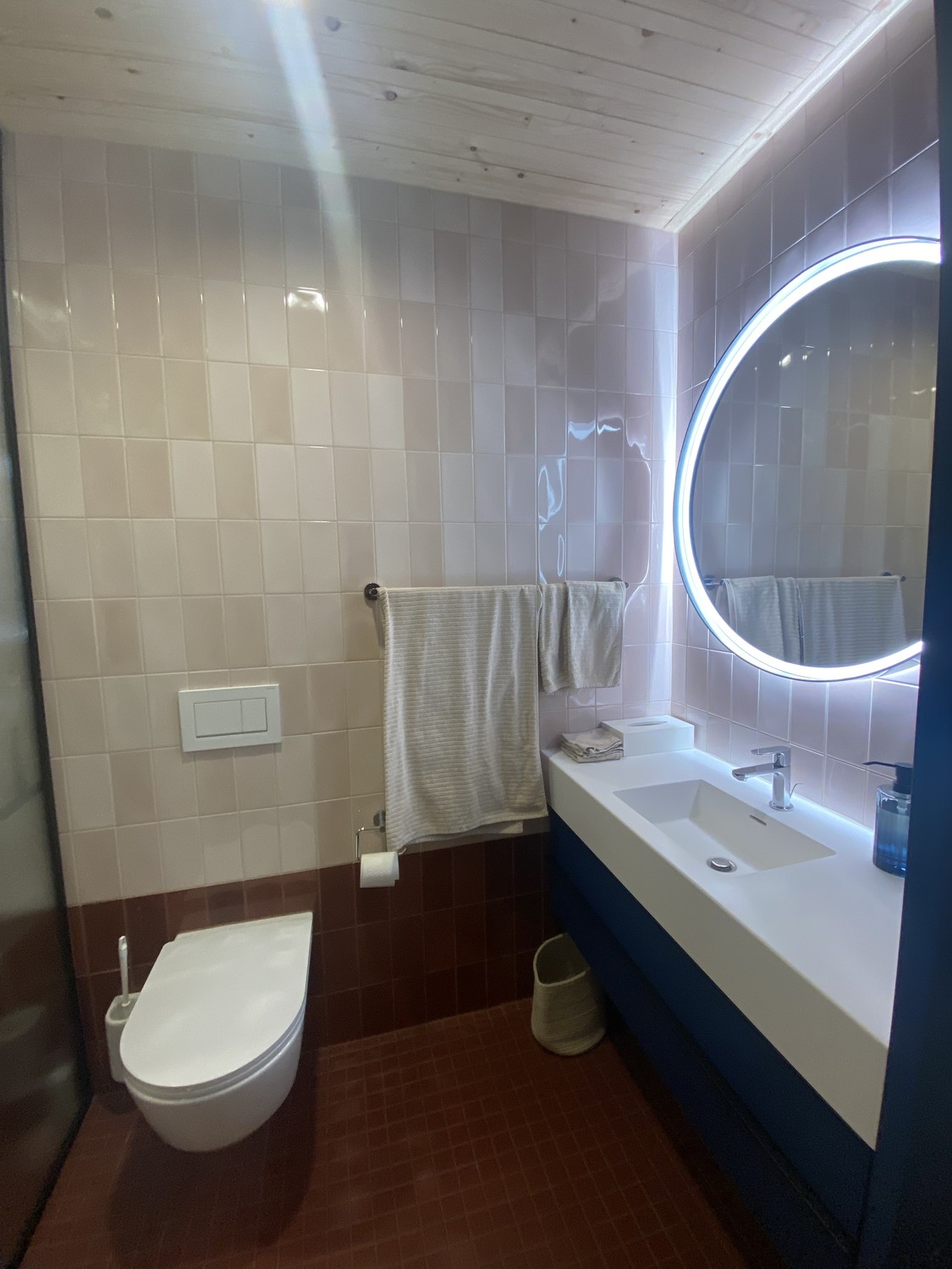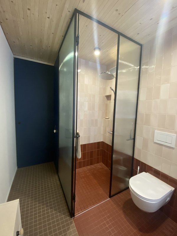Das elegante Badezimmer überzeugt mit einer Dusche, inklusive Regenkopfbrause. Für ein angenehmes Raumklima sorgt die integrierte Raumlüftung sowie das Freecooling-System im Sommer.
