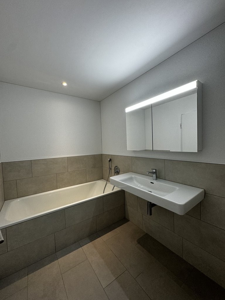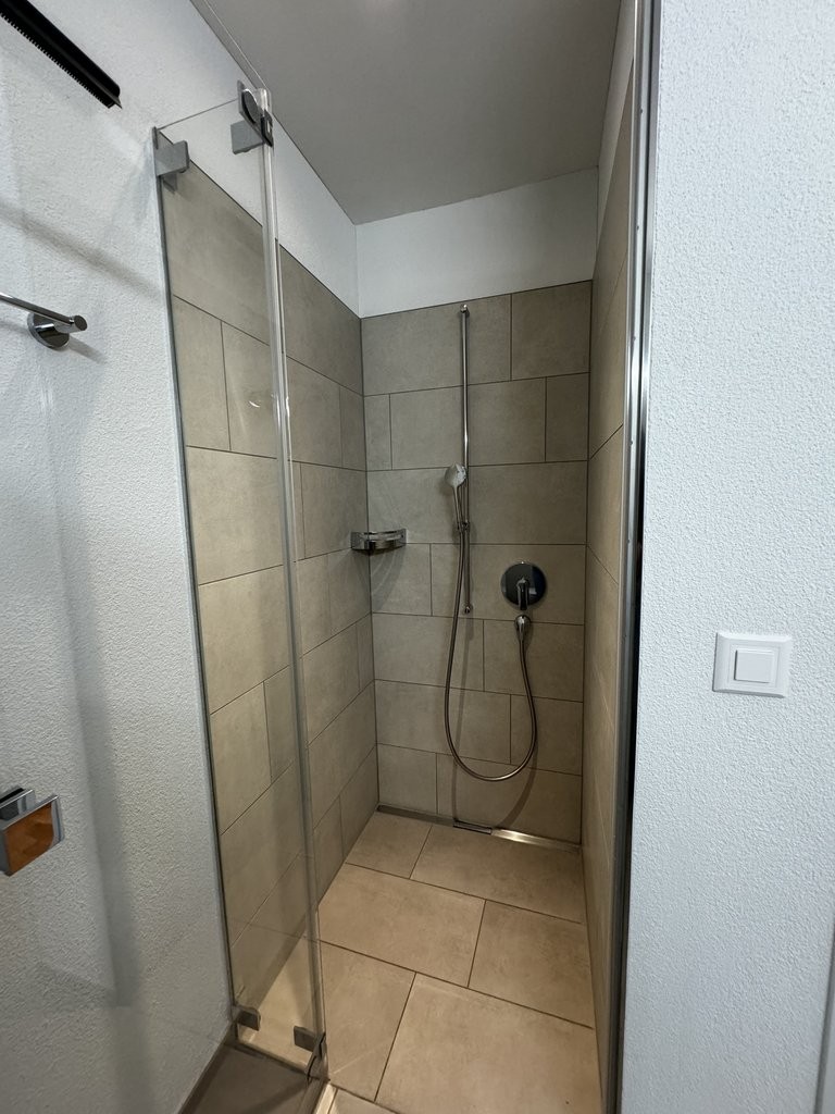 ästhetische Nasszellen, mit Platten in Natursteinoptik, bodenebener Dusche. Im Bad befindet sich zusätzlich eine grosszügige Badewanne und ein Waschturm