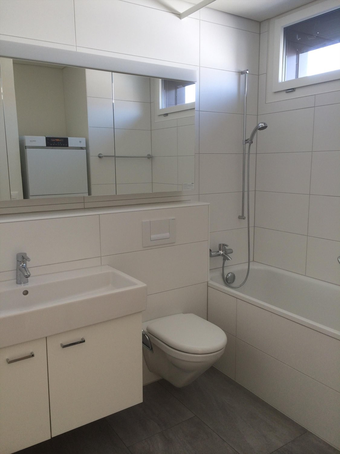 - Bad mit Badewanne, Fenster, grossem Lavabo und Spiegelschrank