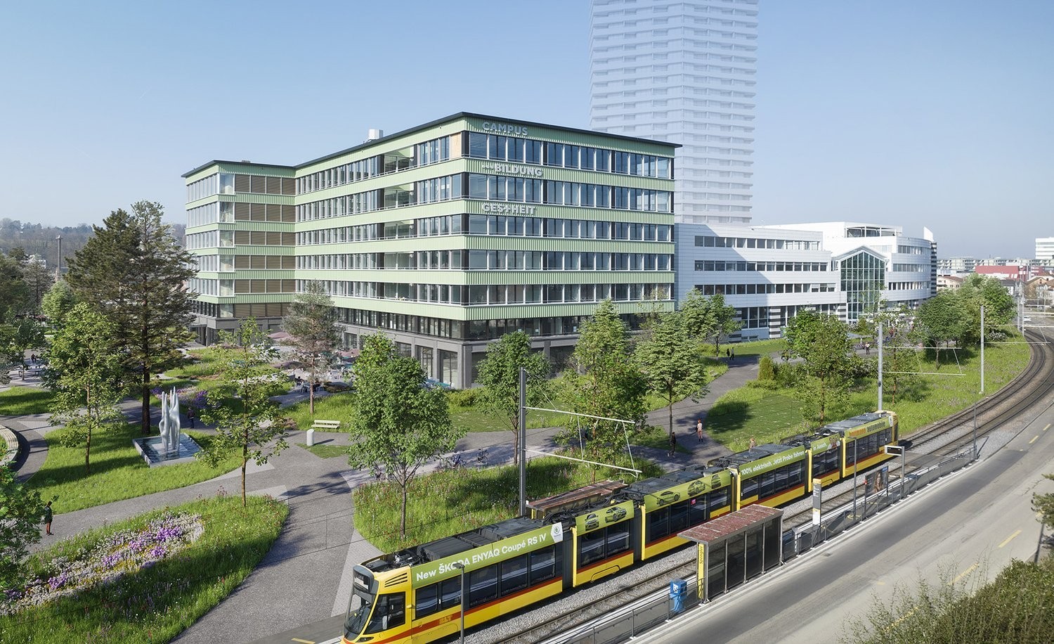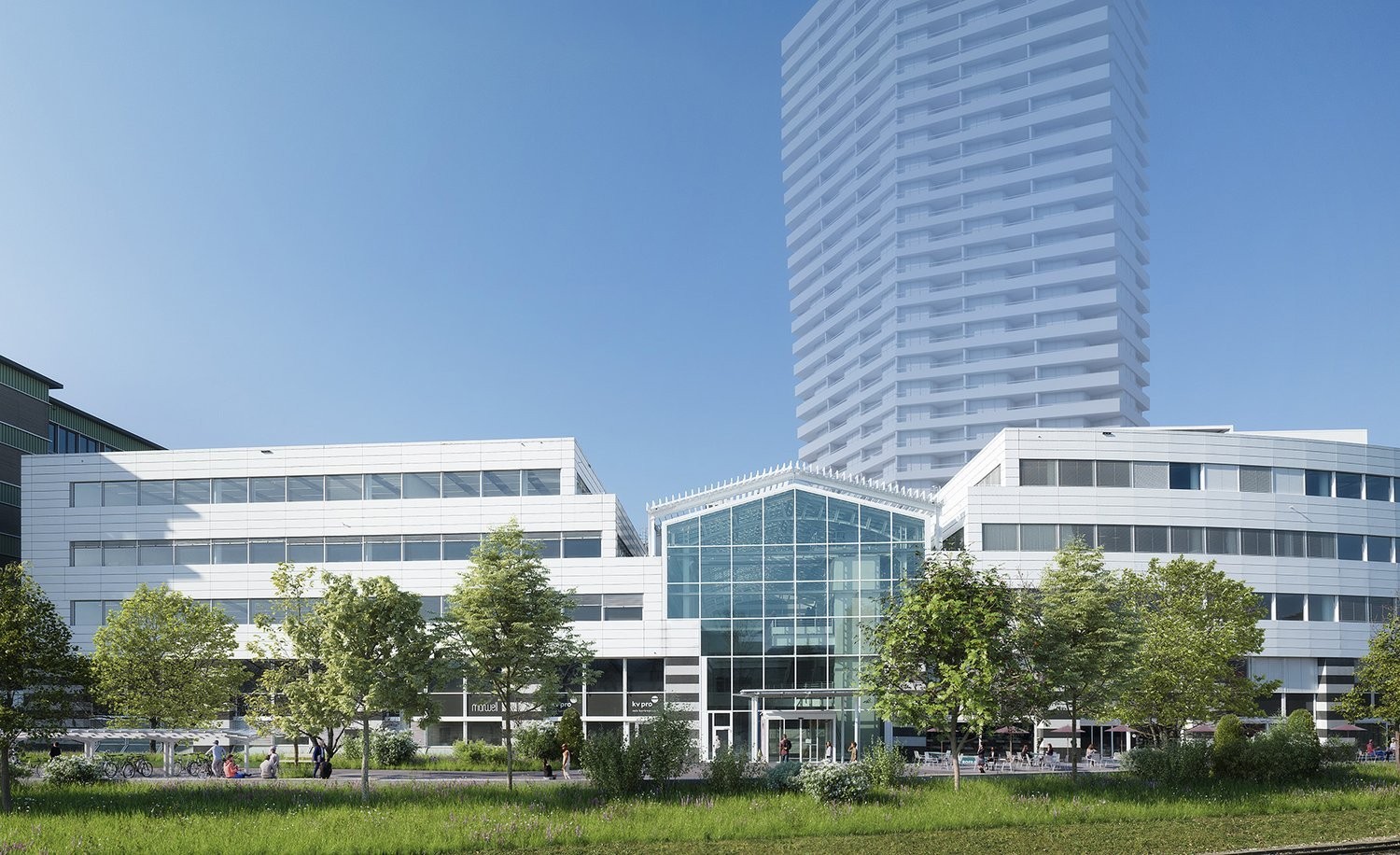 Die neu gestaltete Gartenparkanlage schafft eine hohe Aussenraumqualität im Campus-Feeling und bietet Mitarbeitenden, Patient innen und Besucher innen eine angenehme Umgebung. Ergänzt wird das Angebot durch das hauseigene Restaurant Hundertpunkt . Parkmöglichkeiten für Besucherinnen und Mieterinnen stehen bequem in den Untergeschossen zur Verfügung.
