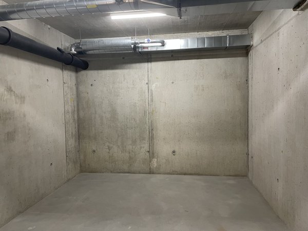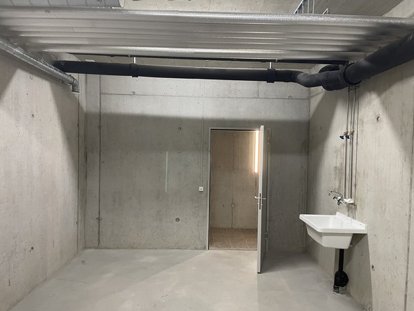Trockener Lagerraum mit hoher Raumhöhe und Waschbecken.