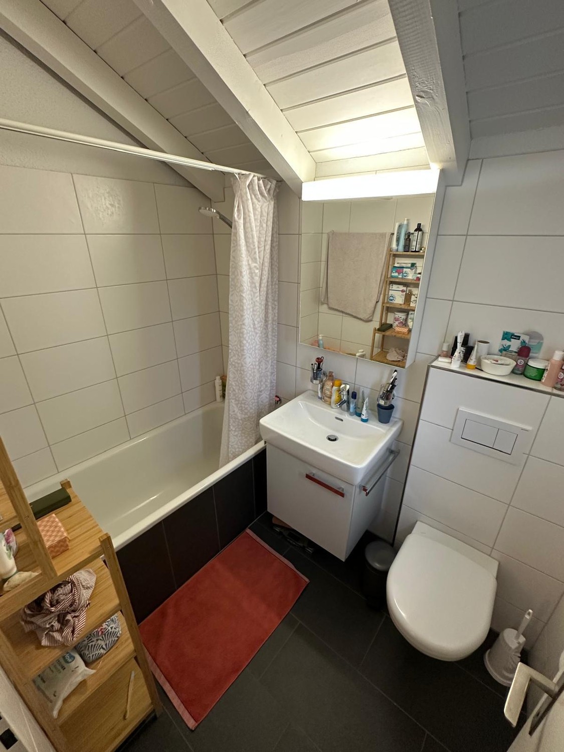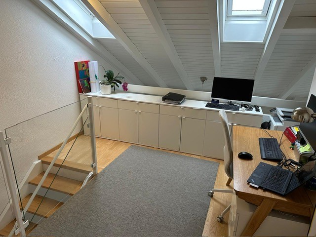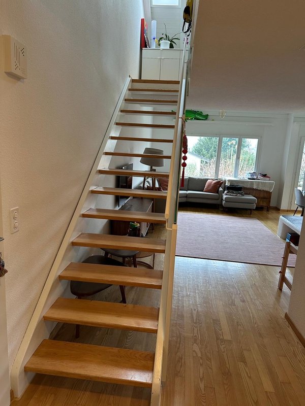 Die zwei Etage Wohnung befindet sich im ersten und zweiten Stock eines angenehmen Vier-Familienhauses und zeichnet sich durch einen grosszügigen Grundriss aus. Vom lichtdurchfluteten Wohnzimmer mit Cheminée hat man direkten Zugang zum Essabteil und zum Balkon. In der neuwertigen Küche mit Glaskeramik und diversen Einbauschränken lässt sich gut kochen. Die Wohnung verfügt über ein Schlafzimmer mit eigenem Bad und Galerie (Oben), zwei weitere Zimmer, einen Duschraum mit WC, sowie ein Gäste-WC (Unten). Zur Wohnung gehören eine separatew Kellerabteil. Eine Tiefgarage für bis zu 2 Fahrzeuge steht für zusätzliche CHF 190.- pro Monat zur Verfügung.