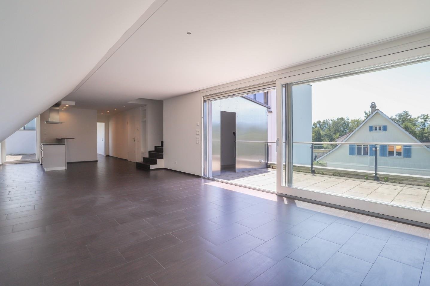 Dieser Wohntraum überzeugt mit einer zeitgemässen, offenen und gut durchdachten Architektur. Eine Kochinsel verbindet die grosse, helle und moderne Küche mit dem Essbereich. Die Wohnung bietet eine einzigartige Atmosphäre mit der Dachschräge im Wohnzimmer und der Treppe, welche den Schlaf- mit Badbereich vom Wohnzimmer trennt. Geniessen Sie den ganzen Tag Sonne und Weitsicht auf den zwei verschieden ausgerichteten Terrassen.