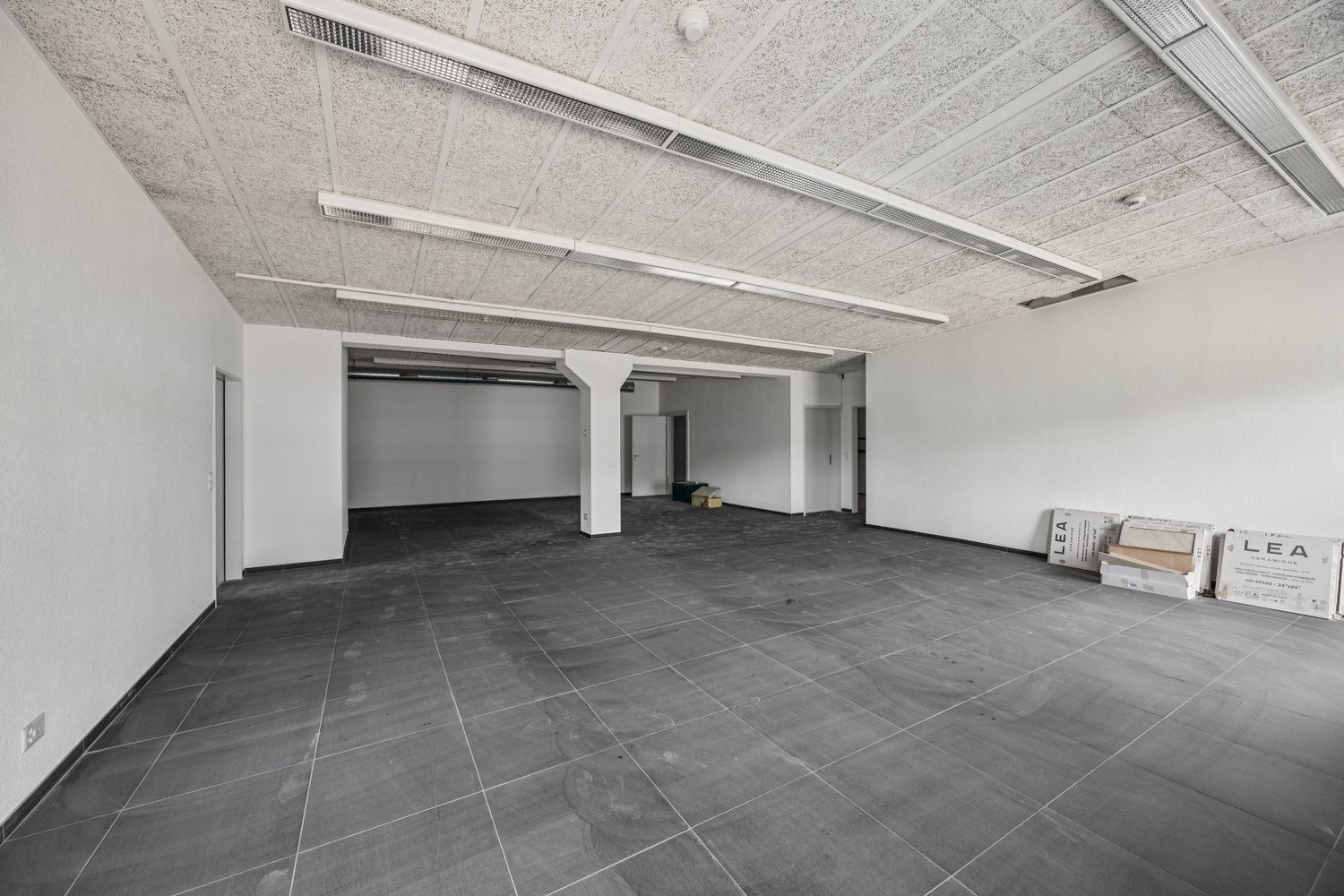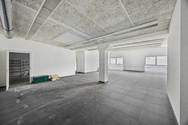 Die Fläche lässt sich flexibel in Räume für Verkauf oder Ausstellung, Grossraumbüro oder kleinere Büro-, Meeting- und Personalräume einteilen.