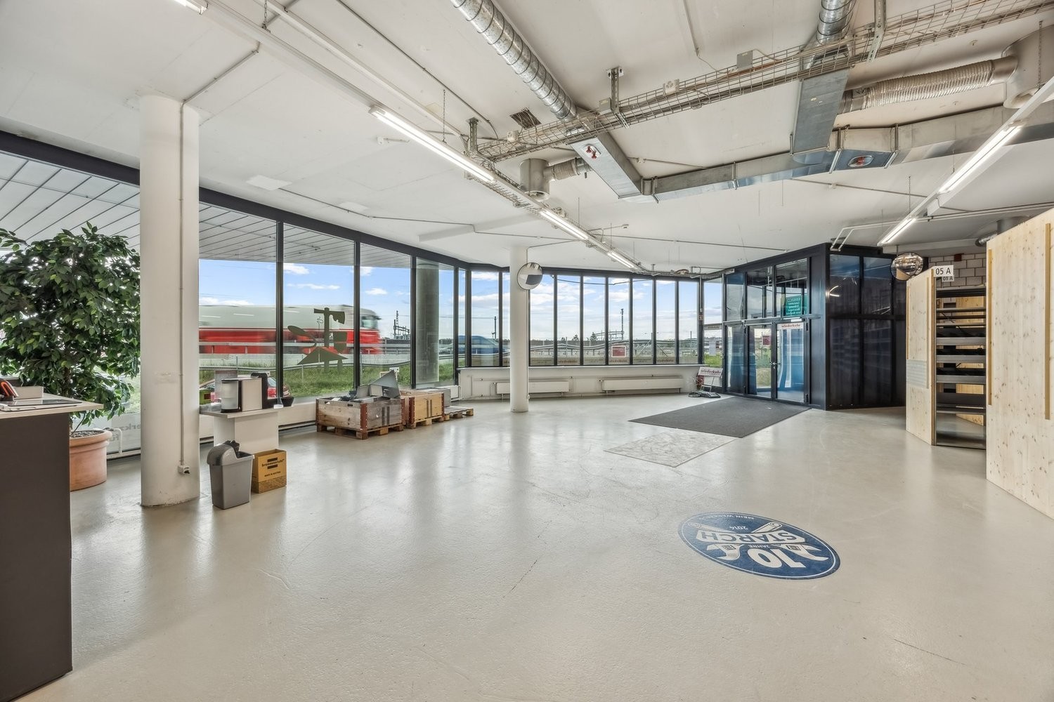 Die Fläche lässt sich flexibel in Räume für Verkauf oder Ausstellung, Grossraumbüro oder kleinere Büro-, Meeting- und Personalräume einteilen.