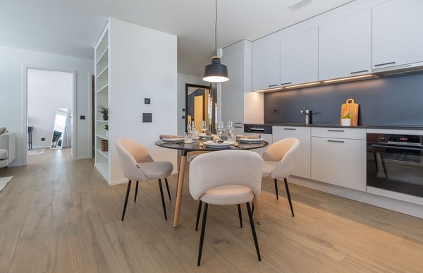 • Stilvolle Innenausstattung mit einer eleganten Kombination aus schwarzen Steckdosen, hellen Küchen und hochwertigen Bodenbelägen