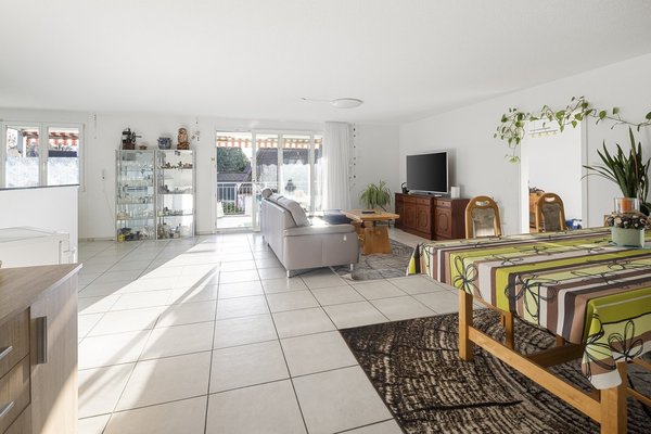 Das Wohn- und Esszimmer überzeugt mit jeder Menge natürlichem Licht, hellem Plattenboden und viel Platz für das tägliche Leben. Von hier aus gelangen Sie direkten auf die grosszügige gedeckte Südterrasse. Hier ist Ihnen Sonnenlicht bis in die Abendstunden sicher.