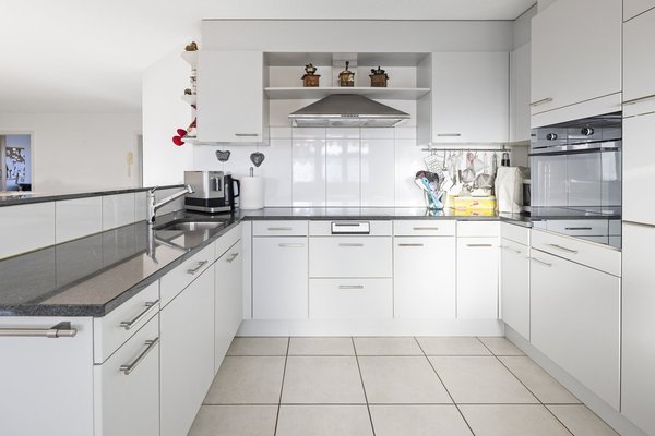 Auch die offene Küche lässt keine Wünsche offen: Sie ist modern, geräumig, mit viel Stauraum versehen und ideal an das grosse Wohn-Esszimmer angegliedert.