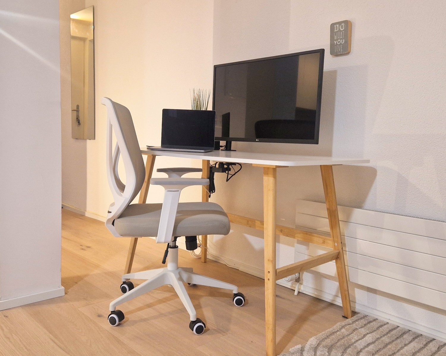 Praktischer Arbeitsplatz mit Monitor, Dockingstation und Highspeed-Internet – ideal fürs Homeoffice