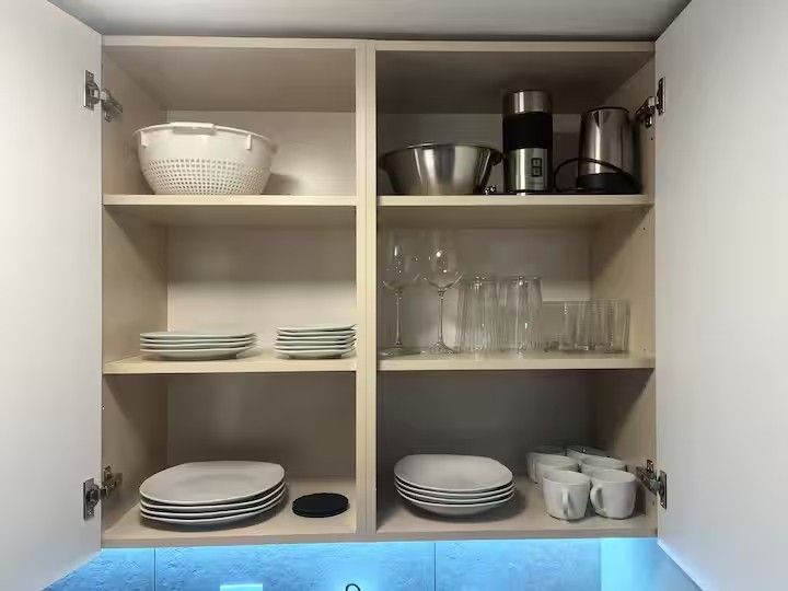 Voll ausgestattete offene Küche mit Kaffeemaschine, Geschirr, Utensilien und diversen Geräten
