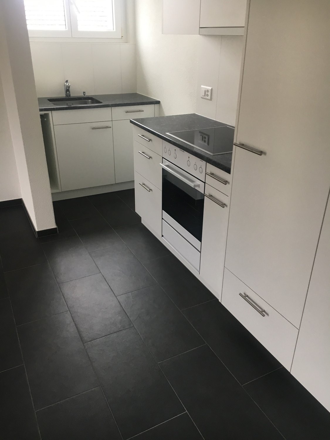 - Wohnbereich/Küche: Moderner, dunkler Plattenboden