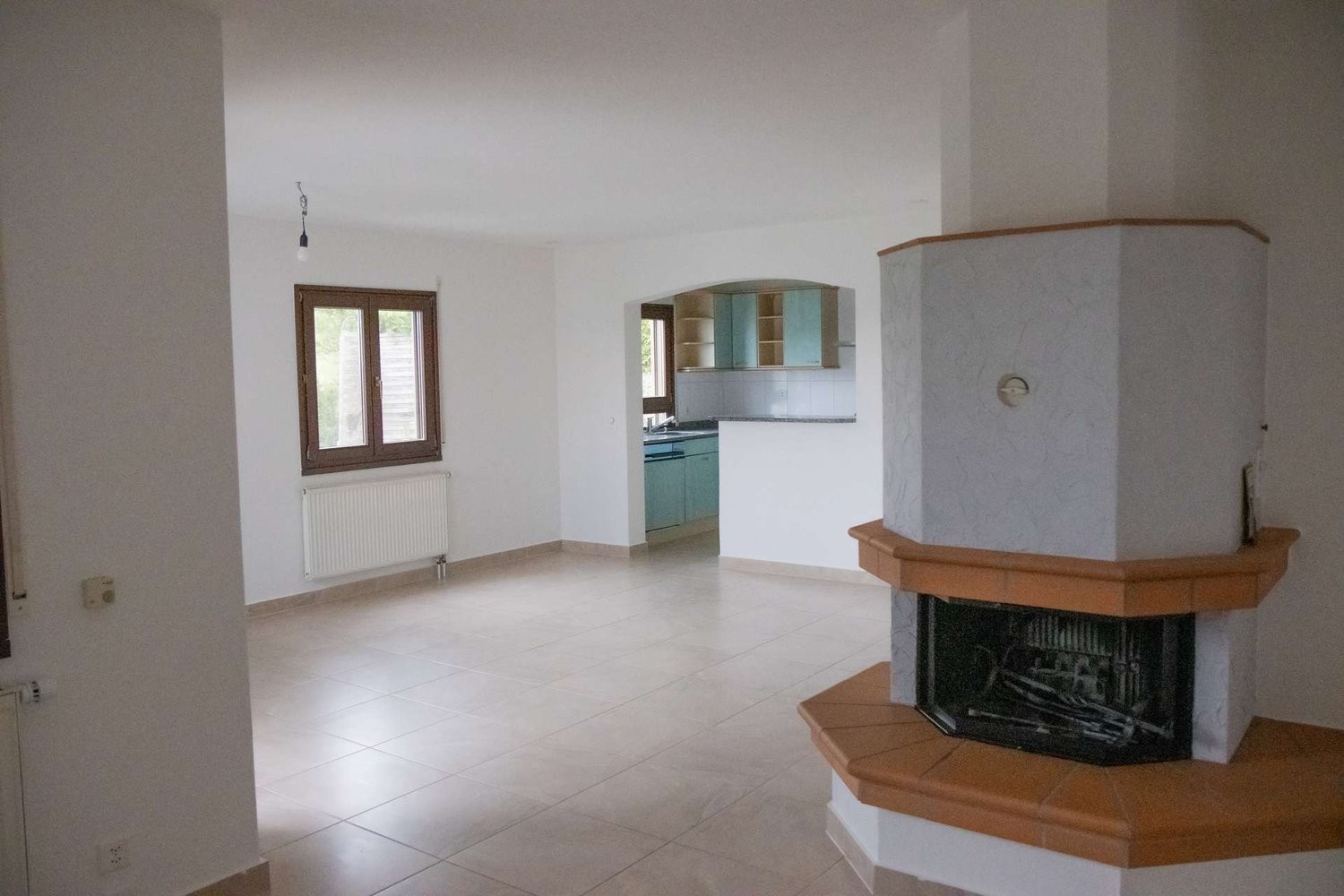 Im ersten Obergeschoss befindet sich der zweite Wohnbereich, der ein helles Wohnzimmer, eine Küche, zwei Schlafzimmer und ein Badezimmer mit Dusche umfasst. Eines der Schlafzimmer bietet Zugang zu einem kleinen Vorplatz, der sich ideal zum Verweilen im Freien eignet. Darüber hinaus bietet diese Etage ein Cheminée und einen Balkon mit traumhafter Aussicht über die weitläufigen Felder.
