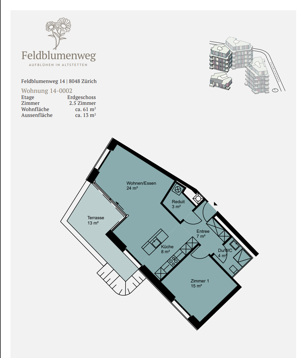Hochwertige 2.5-Zimmer-Wohnung im Erdgeschoss eines modernen Neubaus von 2022 am Feldblumenweg 14 in Zürich Altstetten. Mit 61 m² Wohnfläche und durchdachter Raumaufteilung bietet diese Wohnung zeitgemässes Wohnen in ruhiger Lage.