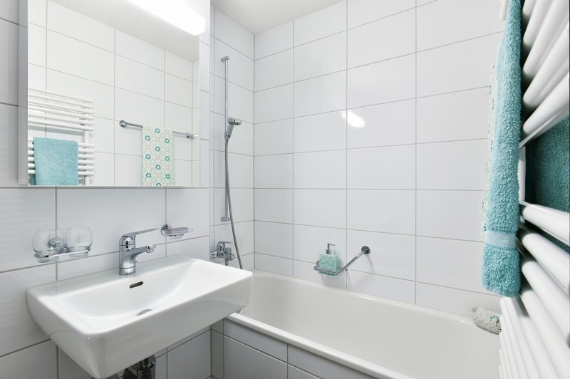 - Modernes Badezimmer mit schwarzen Bodenplatten