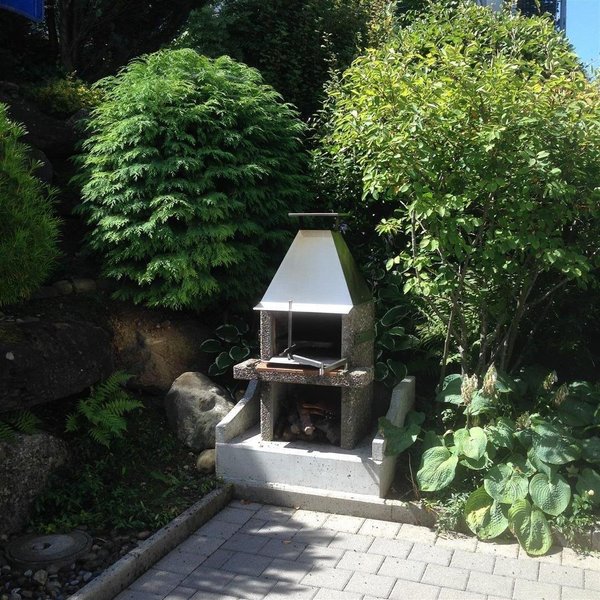 gedeckter Gartensitzplatz mit Cheminée sowie grosse Dachterrasse mit Weitblick