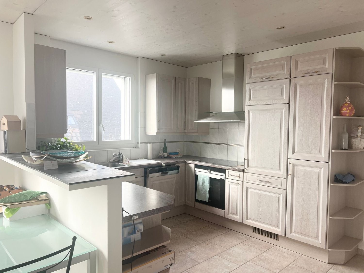 grosse offene Küche zu Wohn-/Essbereich mit Cheminée