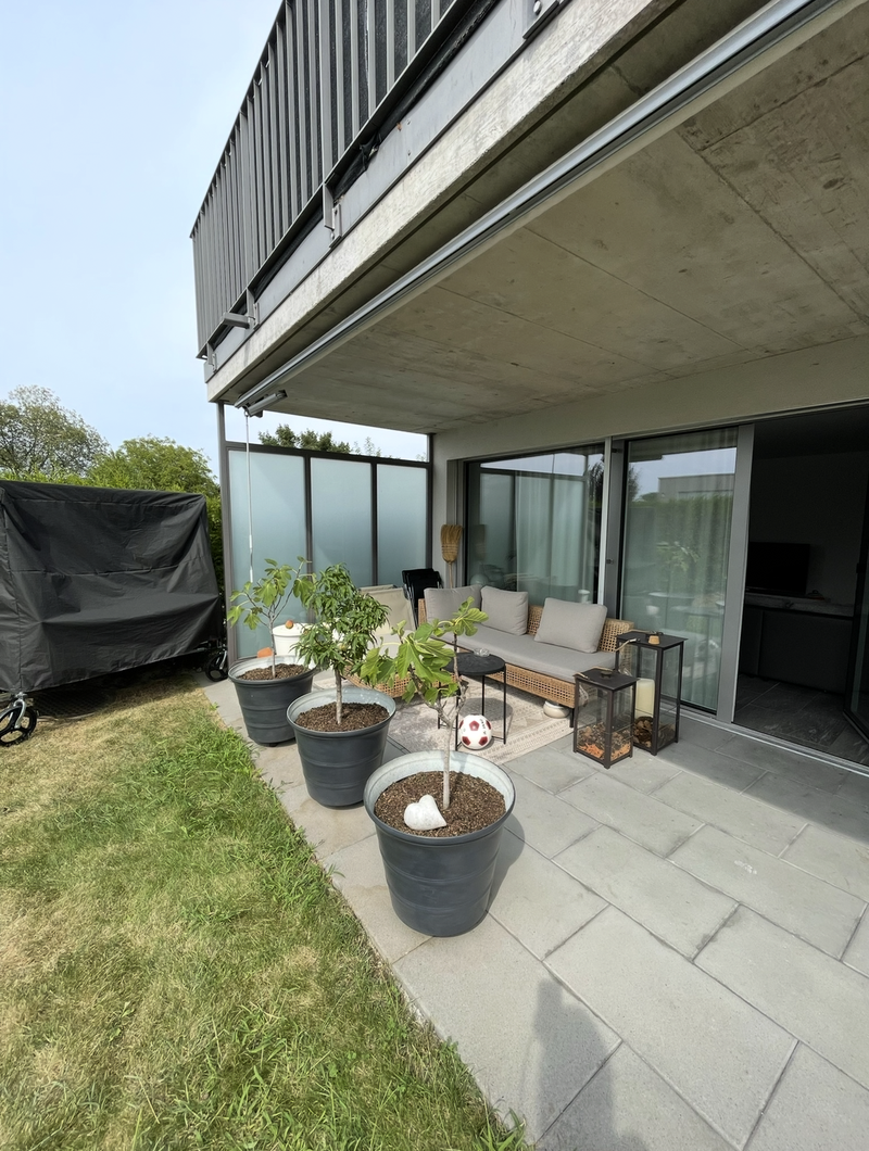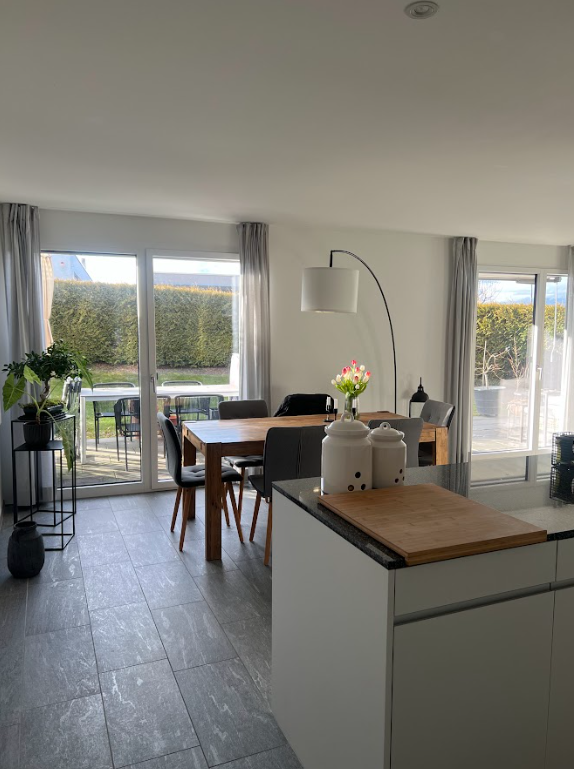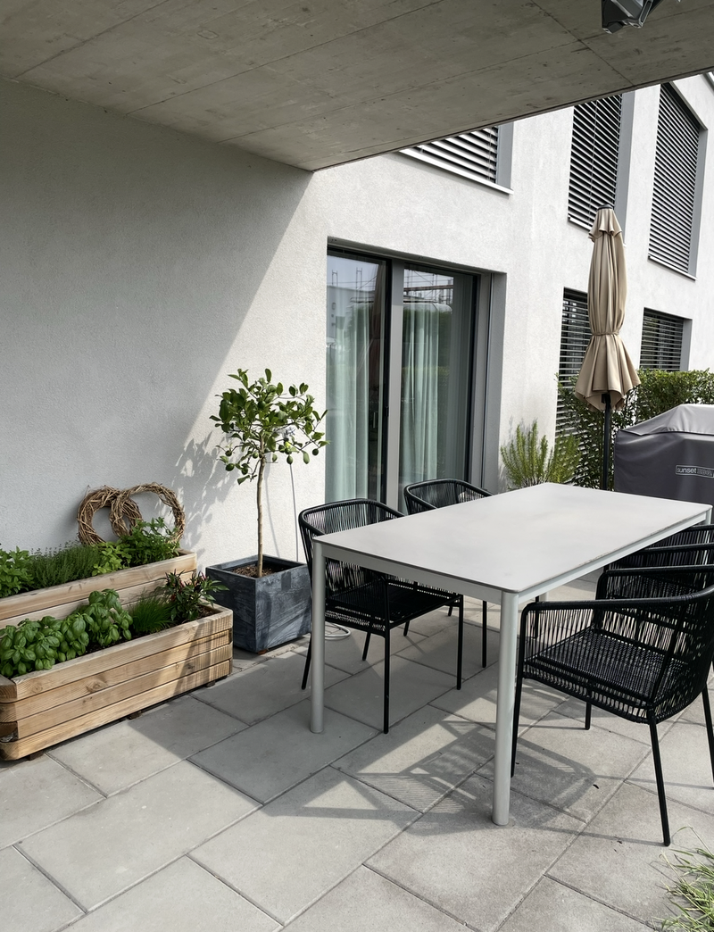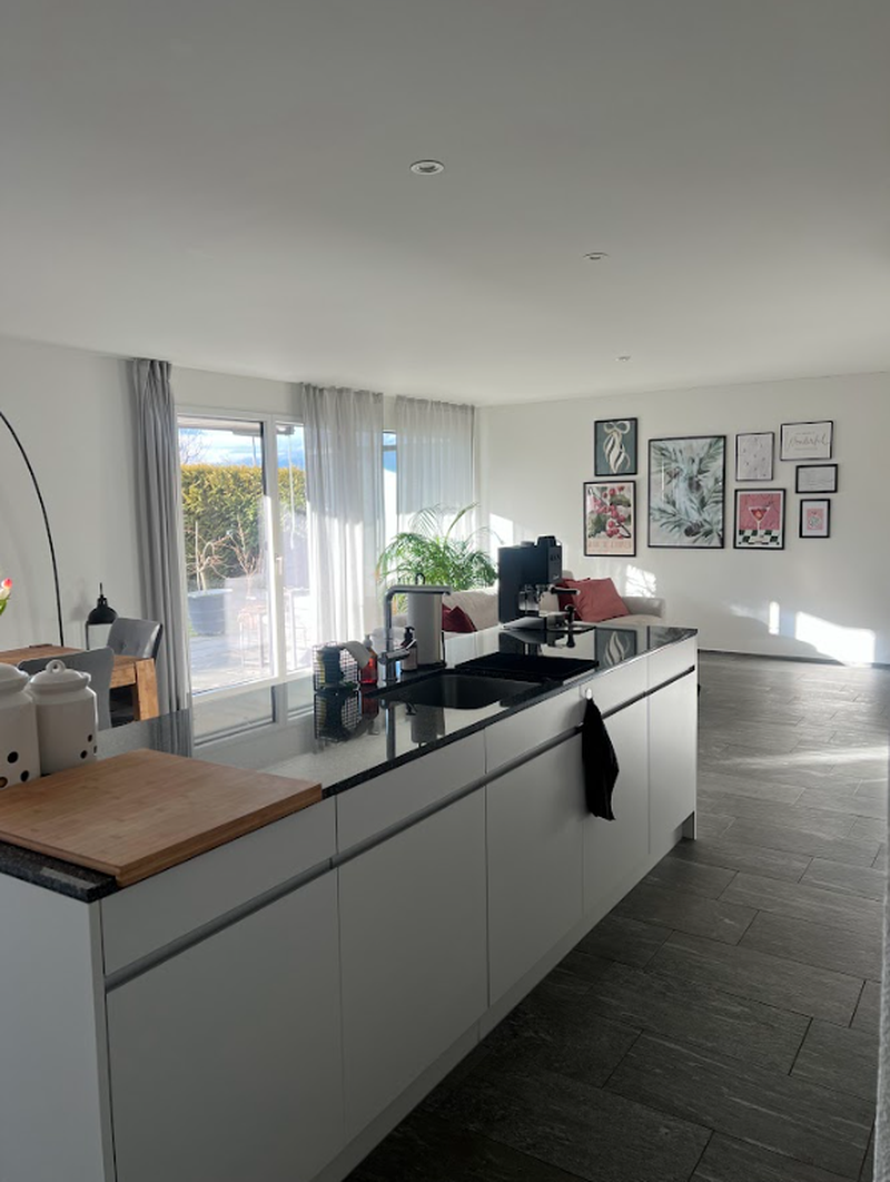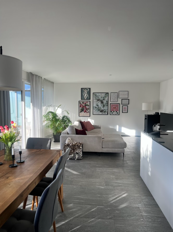 Die Wohnung besticht durch einen grosszügigen und funktionalen Grundriss. Vom Eingangsbereich gelangen Sie über den Gang in den hellen Wohn- und Essbereich mit direktem Zugang zum wunderschönen, teilweise gedeckten Gartensitzplatz. Die moderne Küche ist offen gestaltet und bietet viel Stauraum sowie zeitgemässe Geräte.