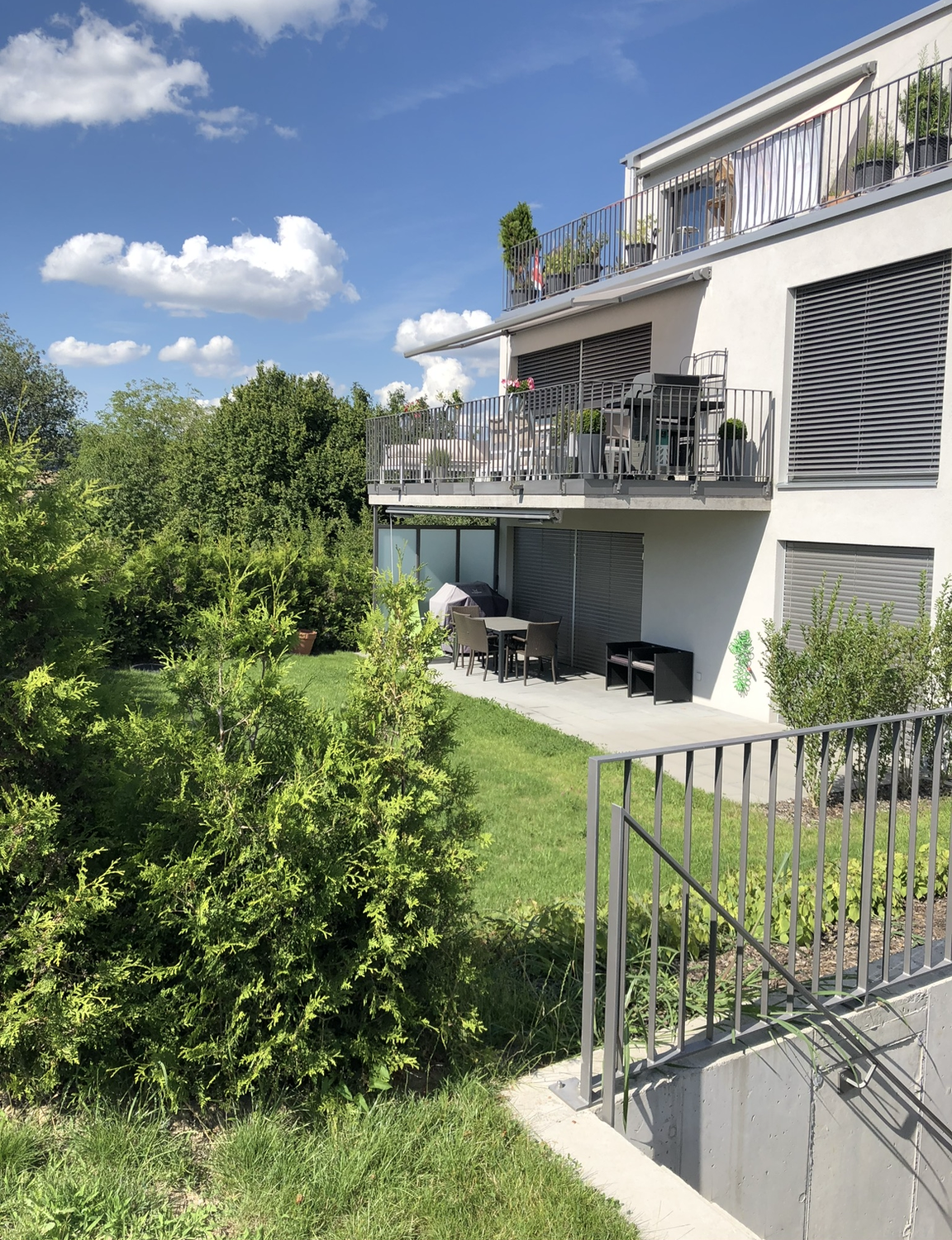 Teilweise gedeckter Gartensitzplatz mit grosszügiger Grünfläche