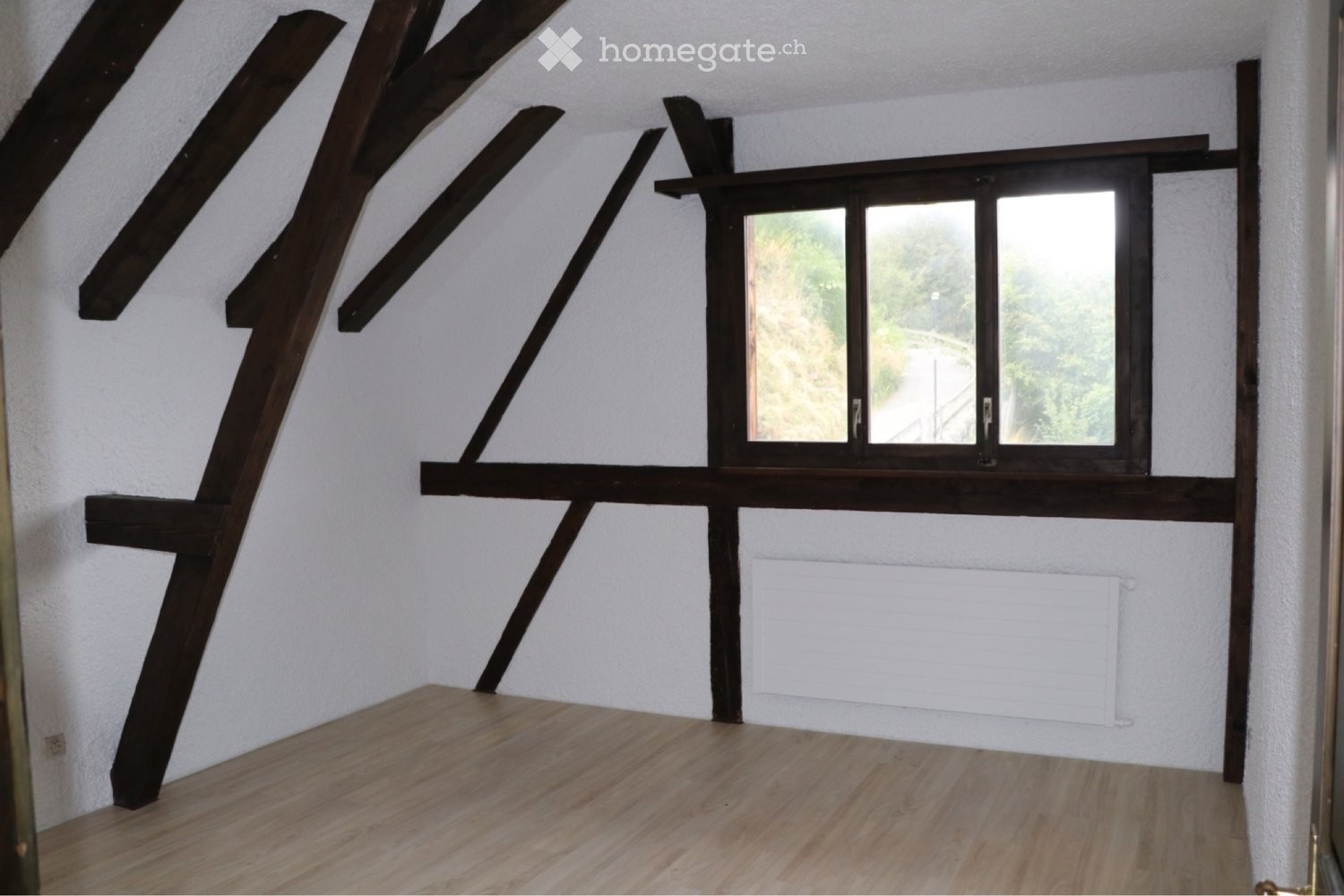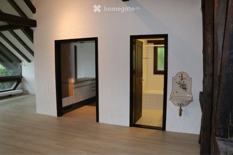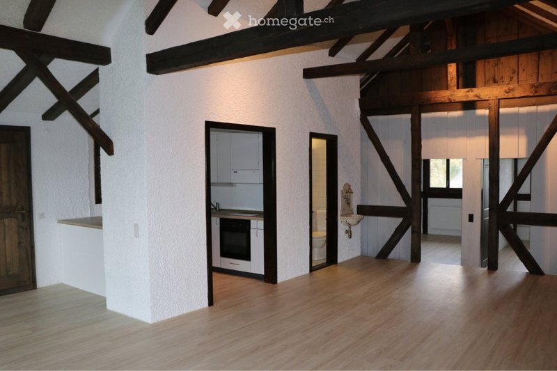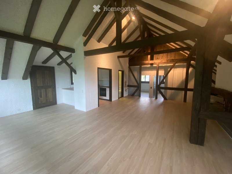 Diese Wohnung zeichnet sich durch ihr offenes Raumkonzept aus. Wohnzimmer und Küche sind offen gehalten und der Mittelpunkt des Raums ist das Cheminée. Neben einem hellen Badezimmer mit Badewanne & Toilette, ergänzen zwei Zimmer die Wohnung. Etliche Holzbalken zieren die hohe Wohnung und bringen einen ganz speziellen Charakter ins Haus. Die Küche ist ausgestattet mit Geschirrspüler, vier Herdplatten, Backofen und einem Kühlschrank mit Tiefkühlfach. Waschmaschine und Trockner teilen sich zwei Parteien.