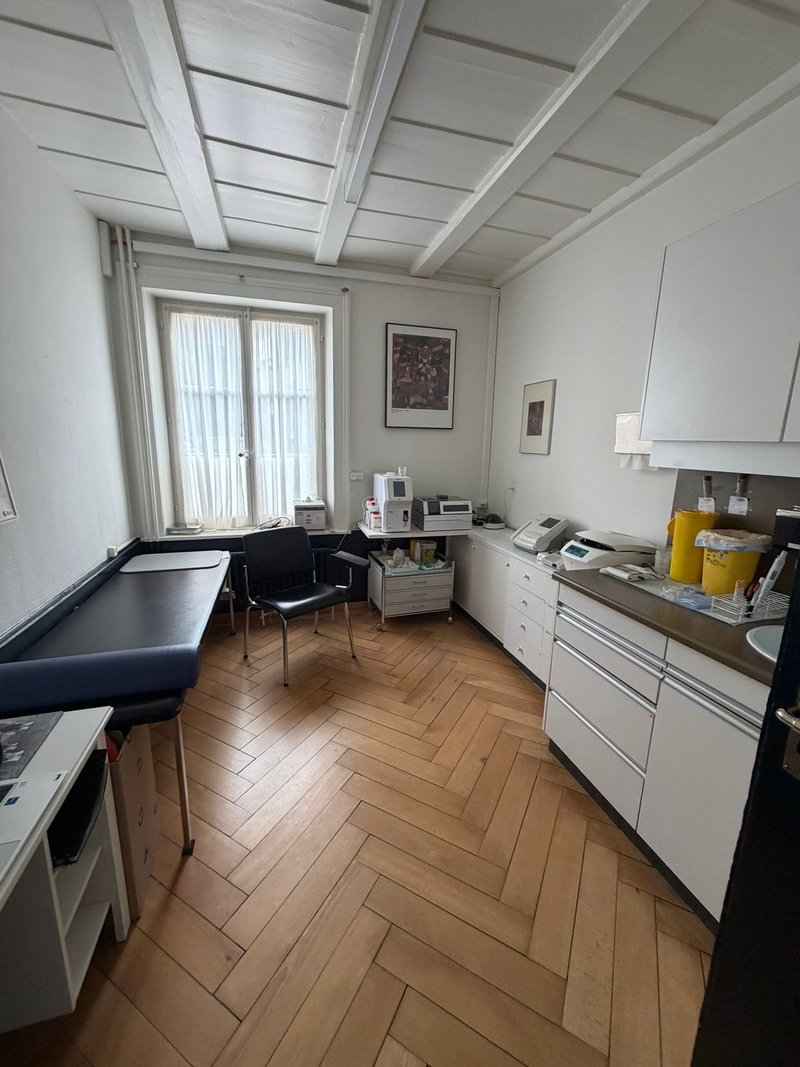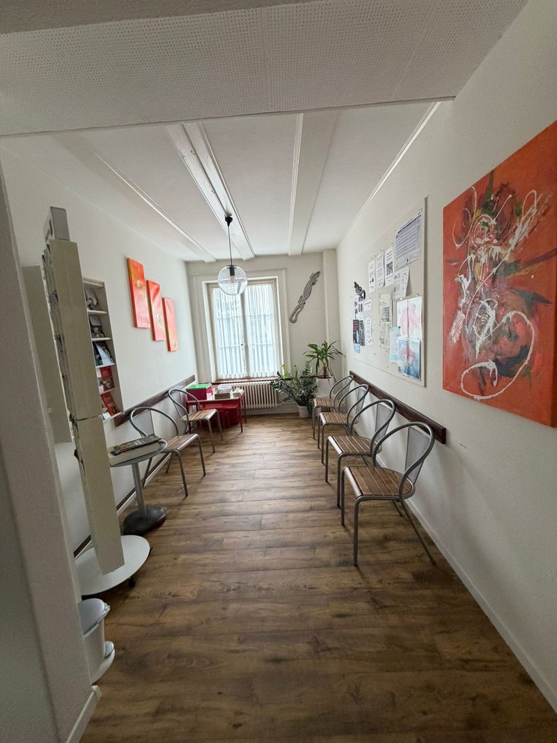 Ein gepflegter Eingangsbereich mit warmem Bodenbelag führt durch einen zentralen Korridor, von welchem die einzelnen Räume optimal erschlossen sind. Ideal für Empfangs- oder Wartezonen. Mehrere separat nutzbare Behandlungs- oder Büroräume