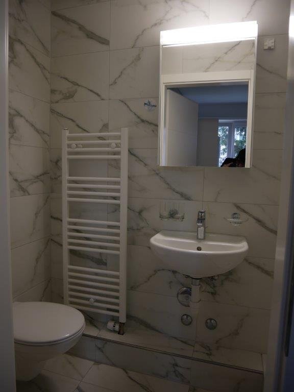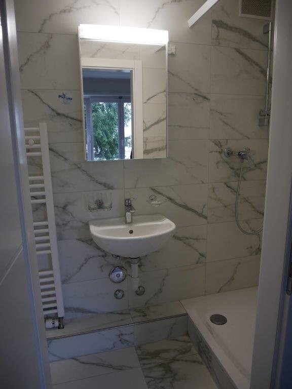 Modernes Badezimmer: Elegant ausgestattet mit weissen Marmorfliesen, Dusche, Waschbecken mit Spiegel und Handtuchheizkörper