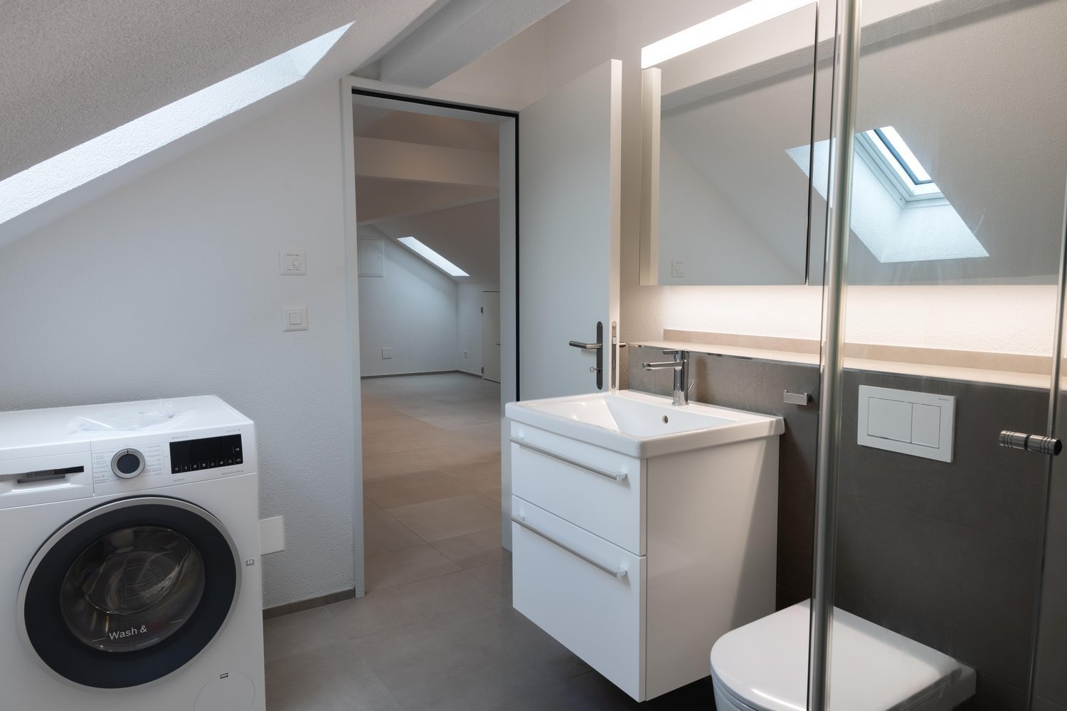 Elegantes Bad Mit Dusche und hochwertigen Armaturen inkl. Waschmaschine & Tumbler