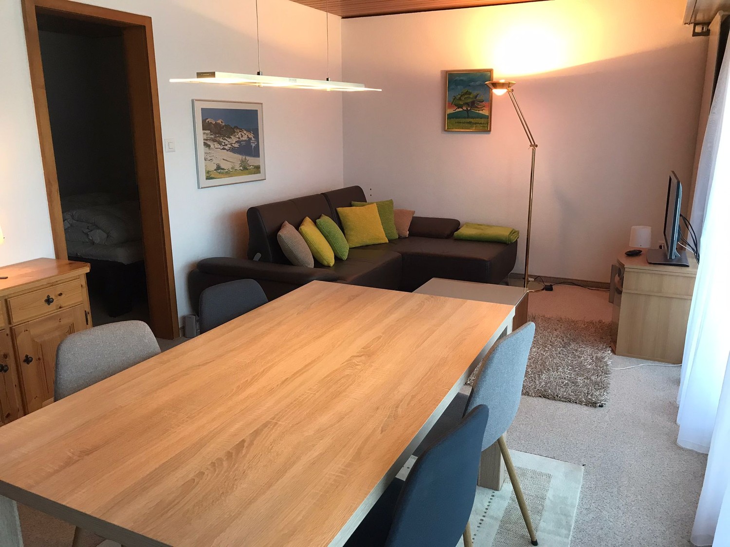 Der Wohn- und Essbereich ist hell und freundlich, die Küche funktional ausgestattet. Das Schlafzimmer bietet ausreichend Platz und Stauraum. Vor der Wohnung gibt es einen Sitzplatz mit wunderschöner Aussicht auf die Churfirsten.