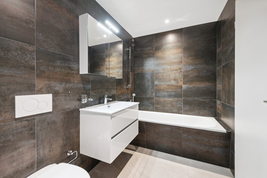 - Nasszelle mit pflegeleichtem, dunklem Plattenboden