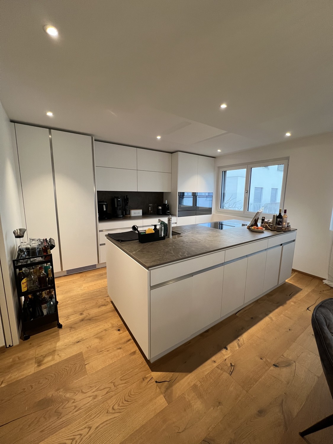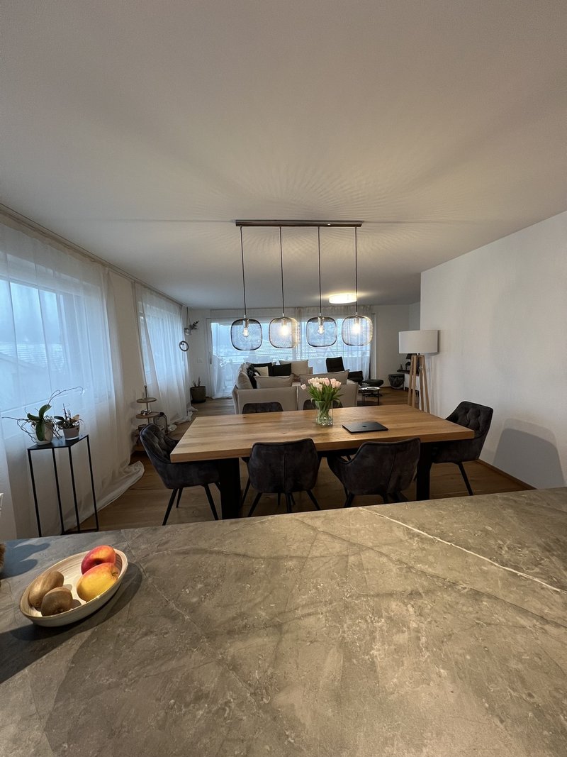 Die Wohnung in Eigentumsstandard überzeugt mit einem grosszügigen, offenen und hellen Wohn- und Essbereich mit Weitsicht und Nachmittags- und Abendsonne. Sie verfügt über eine riesige Küche mit Kochinsel und Induktionsherd.