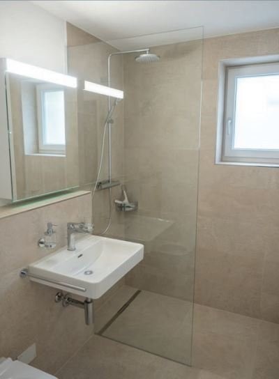 - modernes Badezimmer mit Dusche und Waschmaschine