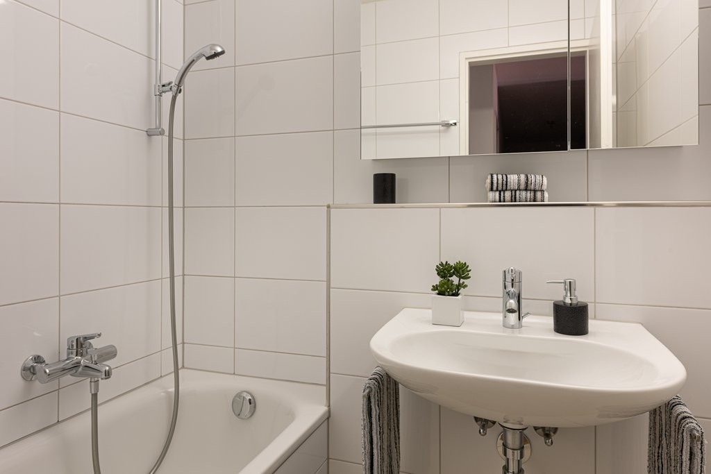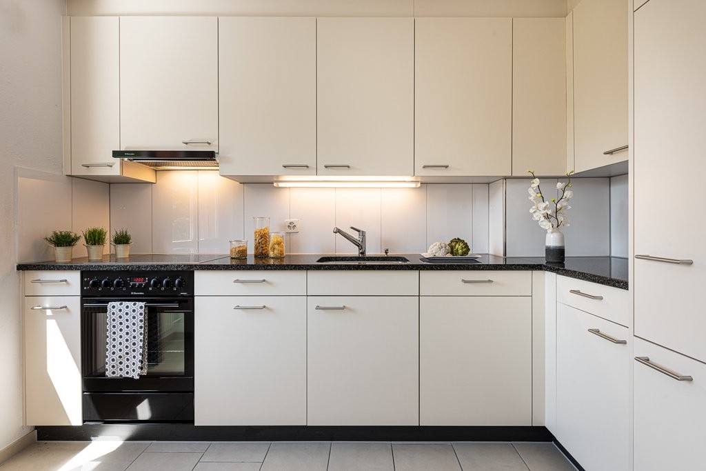 - Küche und Nasszellen mit pflegeleichtem, hellem Plattenboden