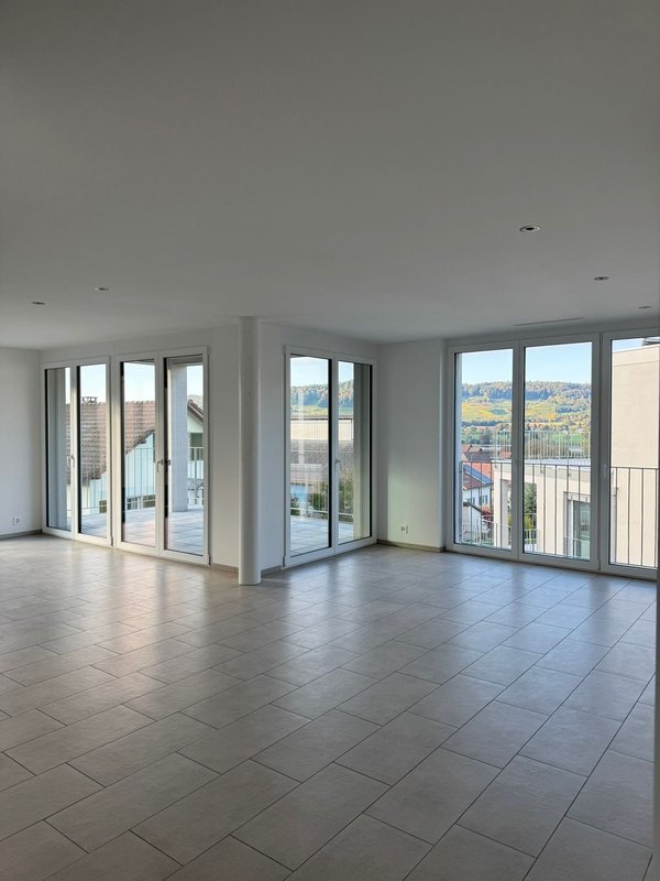 Heller Wohnbereich: Grosszügiger Raum mit bodentiefen Fenstern und Zugang zum 13 m² grossen, überdachten Balkon mit Blick Richtung See.