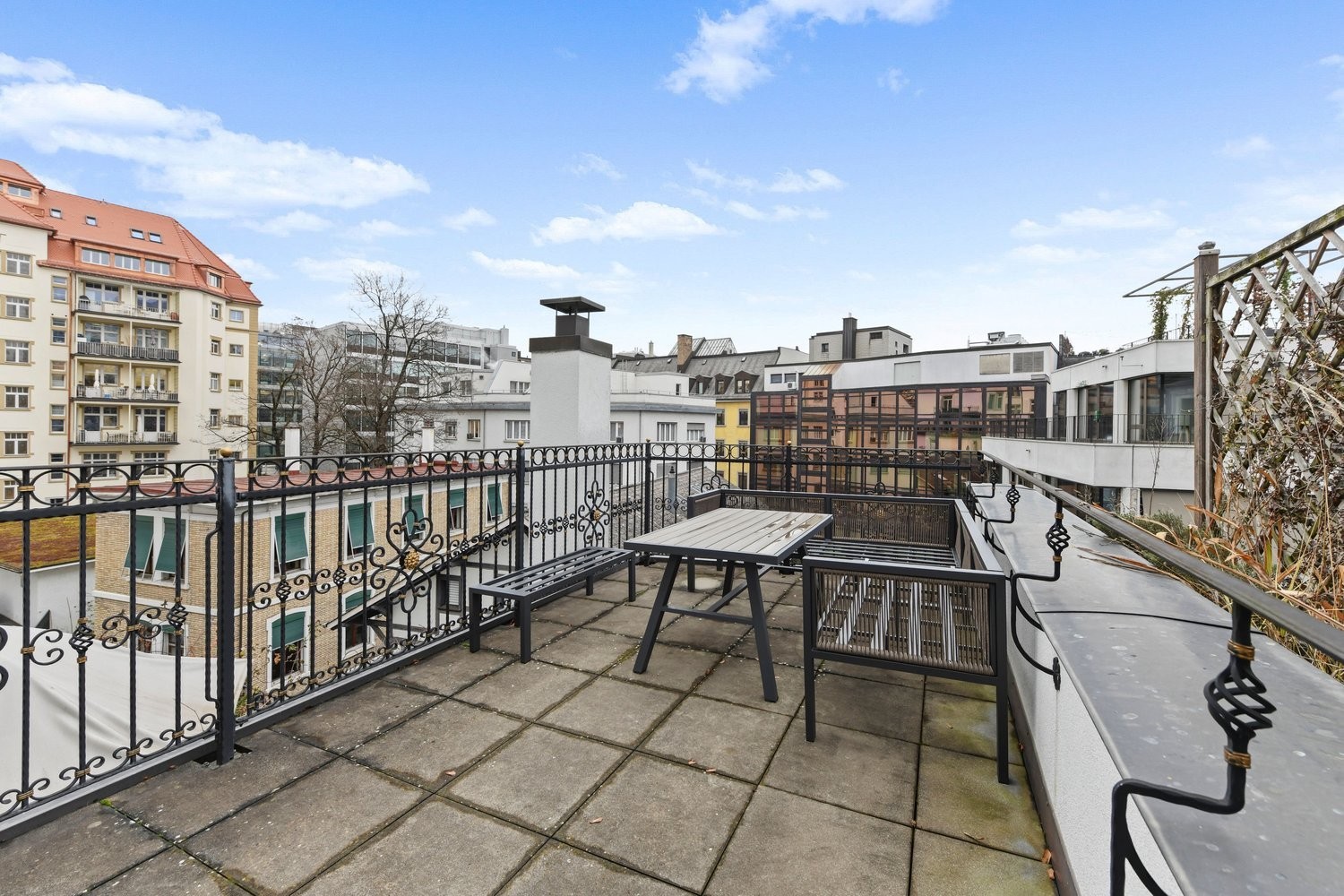 Aussenbereich : wunderschöne, grosse Terrasse zur Mitbenutzung; Stadtblick - perfekt für Pausen oder kurze Meetings