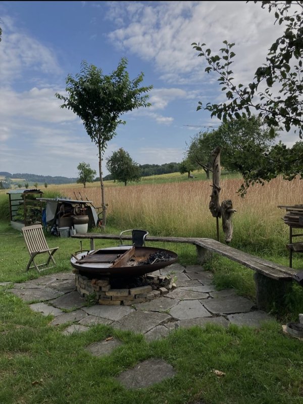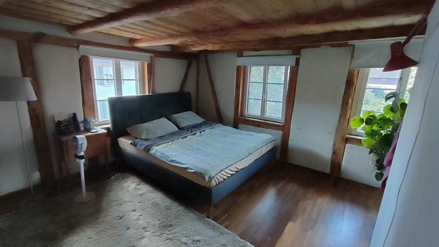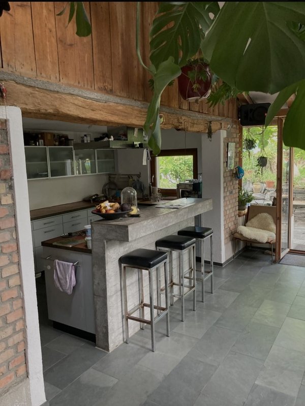 A warm, cozy 4.5-room house in Berikon with two floors, lots of natural light, and a beautiful green environment. The house has a very comfortable atmosphere with many plants, natural materials, and a spacious layout.