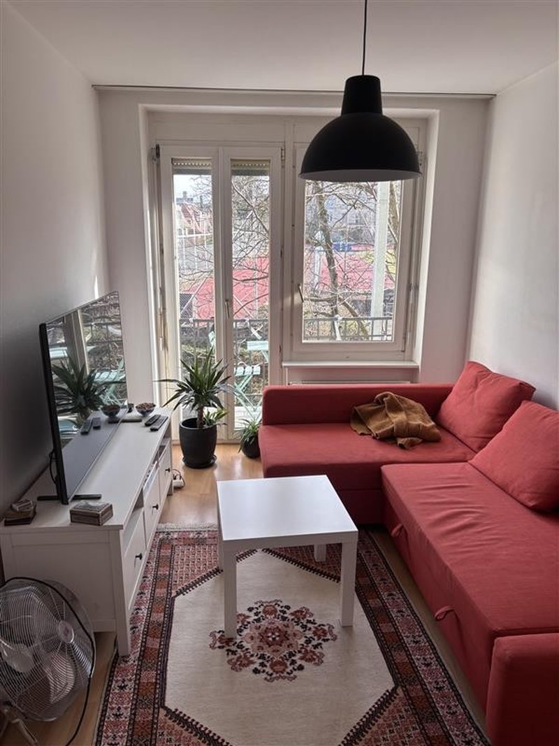 Please note that I'm looking to sell my furniture (red sofa, bookshelf, wardrobe for clothes, and bed).
