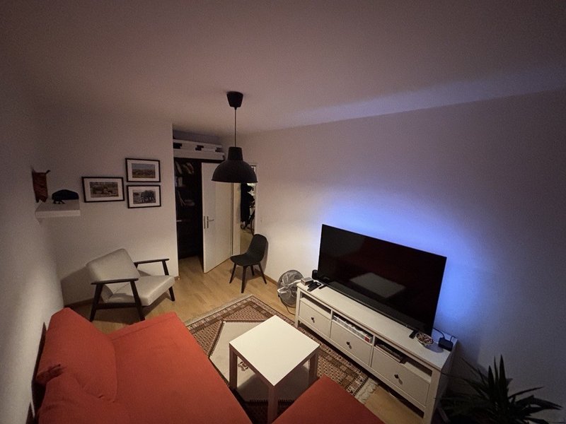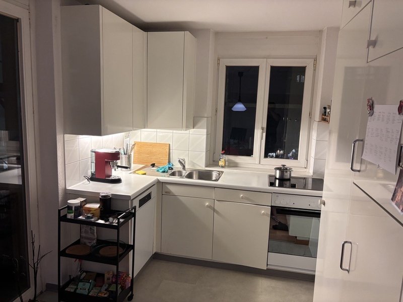 2.5 apartment directly on Goldbrunnenplatz. The apartment is 65m2 with 2 bedrooms, 1 living room, 1 kitchen with dining space, and 2 balconies (one giving on Goldbrunnenplatz, one on the school behind).