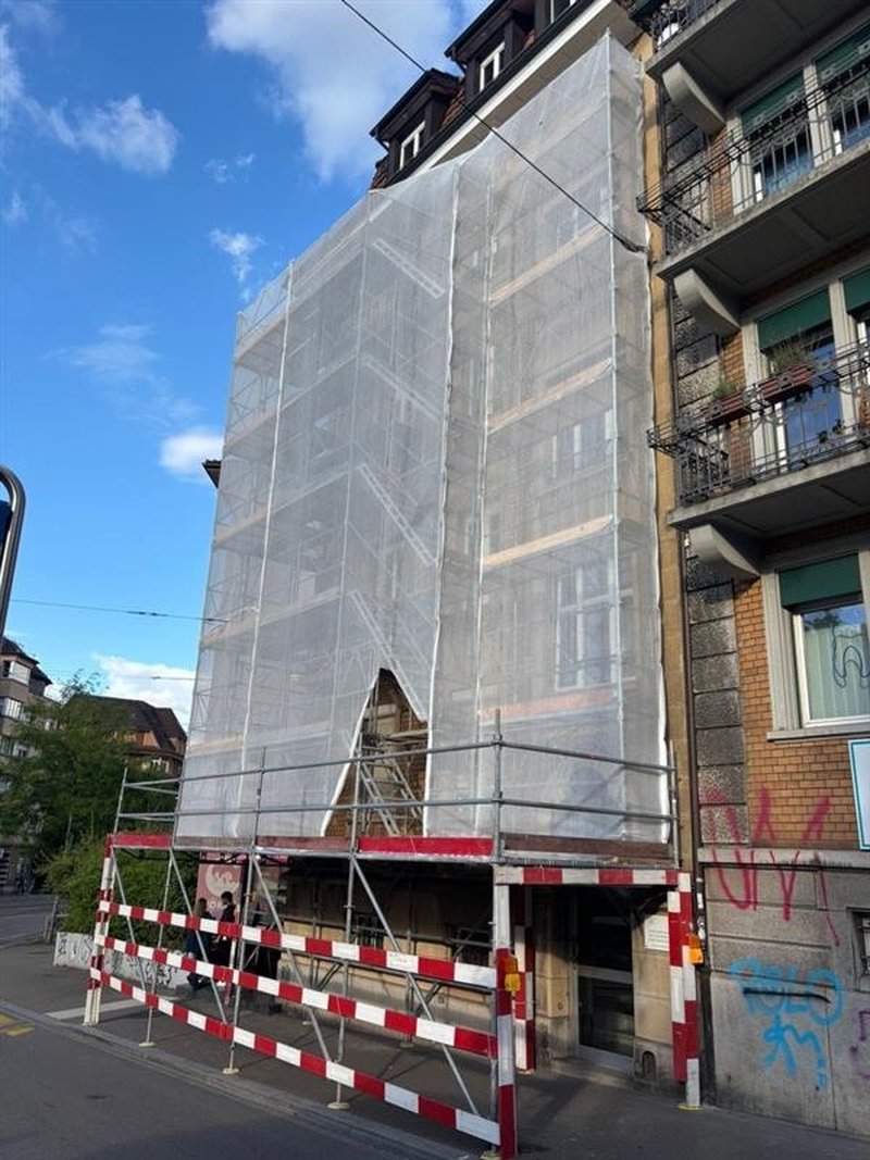 Bitte beachten Sie, dass die Fassade derzeit an zwei Seiten des Gebäudes mit einem halbtransparenten Netz eingerüstet ist. Dies ist vorübergehend, bis die Fassadensanierungsarbeiten abgeschlossen sind. Siehe zweites Bild.