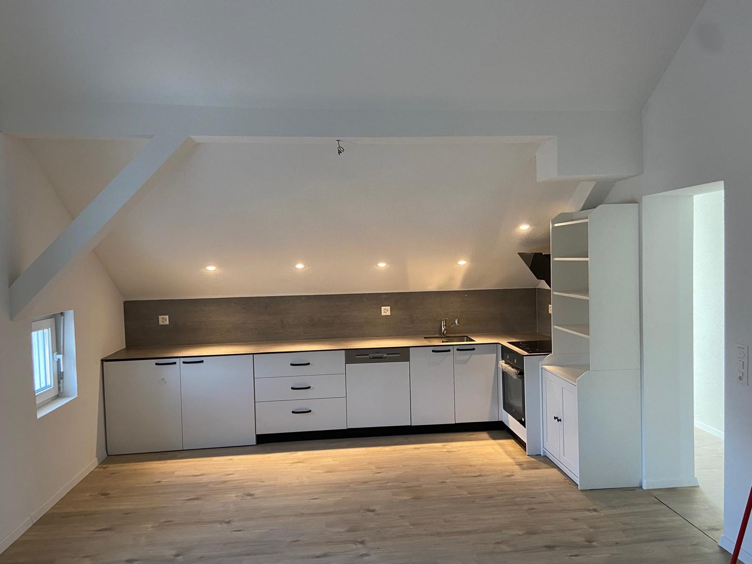 ✨ Grosszügiger Wohn- und Essbereich mit offener Küche Der offene Grundriss mit sichtbaren Dachschrägen und Balken verleiht der Wohnung eine besondere Atmosphäre. Die Küche bietet viel Arbeitsfläche sowie Geschirrspüler und Glaskeramik-Backofen.
