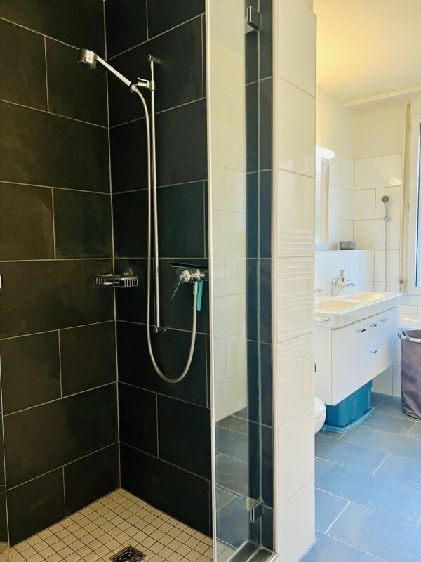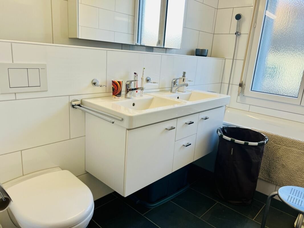 Das helle Badezimmer (mit Fenster) hat ein Doppel-Lavabo, eine Toilette sowie eine Dusche. Eine Gäste-Toilette mit Lavabo ist ebenfalls vorhanden.