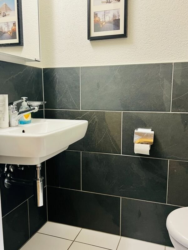 The bright bathroom (with a window) has a double washbasin, a toilet, and a shower. A guest toilet with a washbasin is also available.