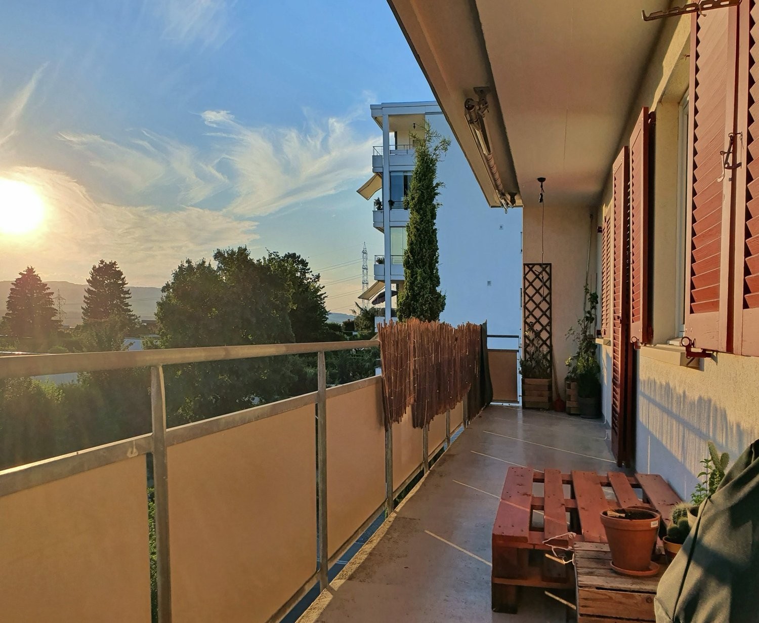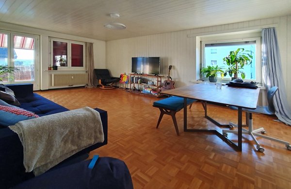 Grosses Wohnzimmer mit Parkett-Boden und Zugang zum grossen Balkon gegen die Abendsonne