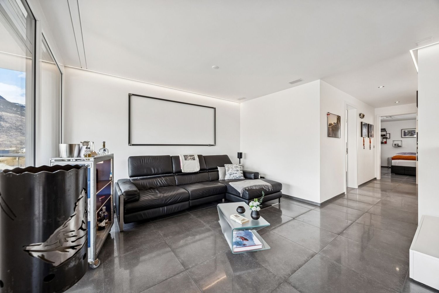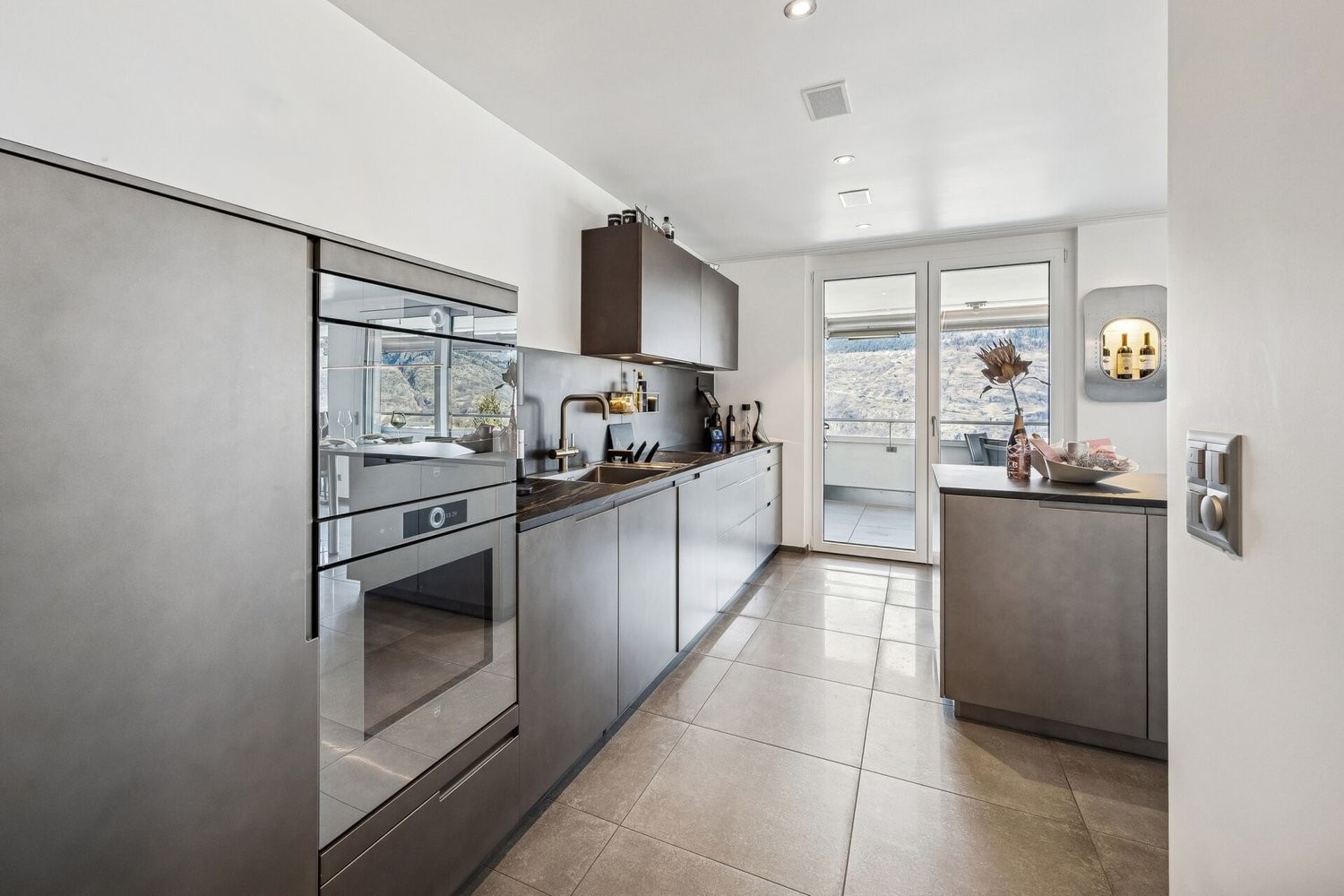Beim Eintreten empfängt Sie ein grosszügiger Eingangsbereich. Hochwertige Keramikplatten verleihen dem Raum eine moderne Ausstrahlung und sind mit einer Fussbodenheizung ausgestattet, die im Sommer zusätzlich zur leichten Kühlung beiträgt. Bereits hier zeigt sich der zeitgemässe Ausbaustandard. Der offen konzipierte Wohn-, Ess- und Küchenbereich bildet das Zentrum der Wohnung und schafft ein angenehmes Raumgefühl. Grossflächige Fenster lassen viel Tageslicht einfallen und eröffnen eine beeindruckende Weitsicht. Die Küche präsentiert sich klar gestaltet und hochwertig materialisiert. Die elegante Arbeitsfläche sowie die geradlinige Ausführung fügen sich stimmig in das Gesamtbild ein und unterstreichen den modernen Charakter. Das stilvoll abgestimmte Mobiliar im Wert von CHF 30'000.- ist Bestandteil des Kaufpreises und fügt sich harmonisch in das hochwertige Gesamtkonzept ein.